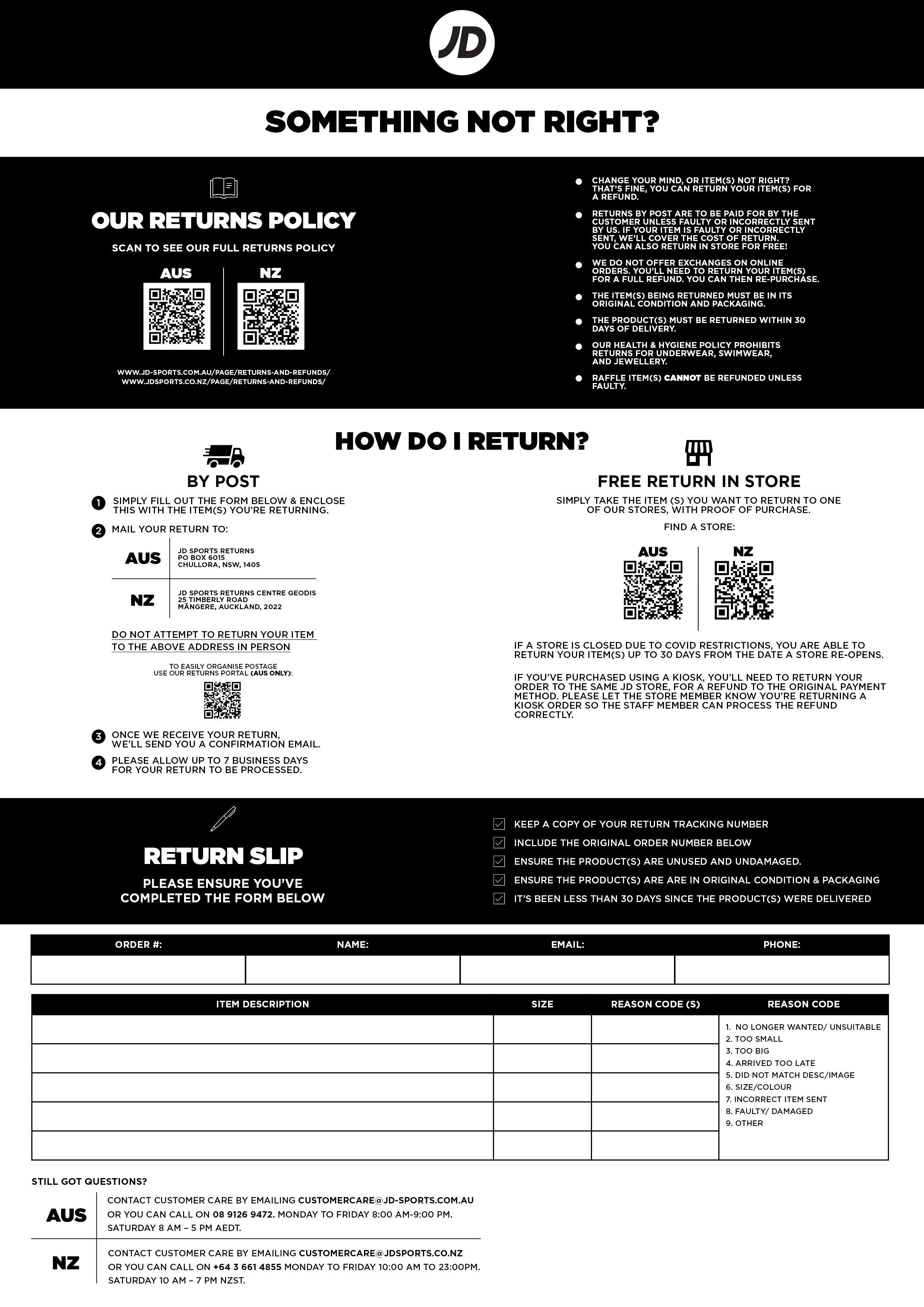 Note: If you’ve purchased using an in-store kiosk, you can return your order to any JD store with proof of purchase, If you haven't retained your receipt you can only return your order to the original store where purchased.. This will need to be made to the original payment type.