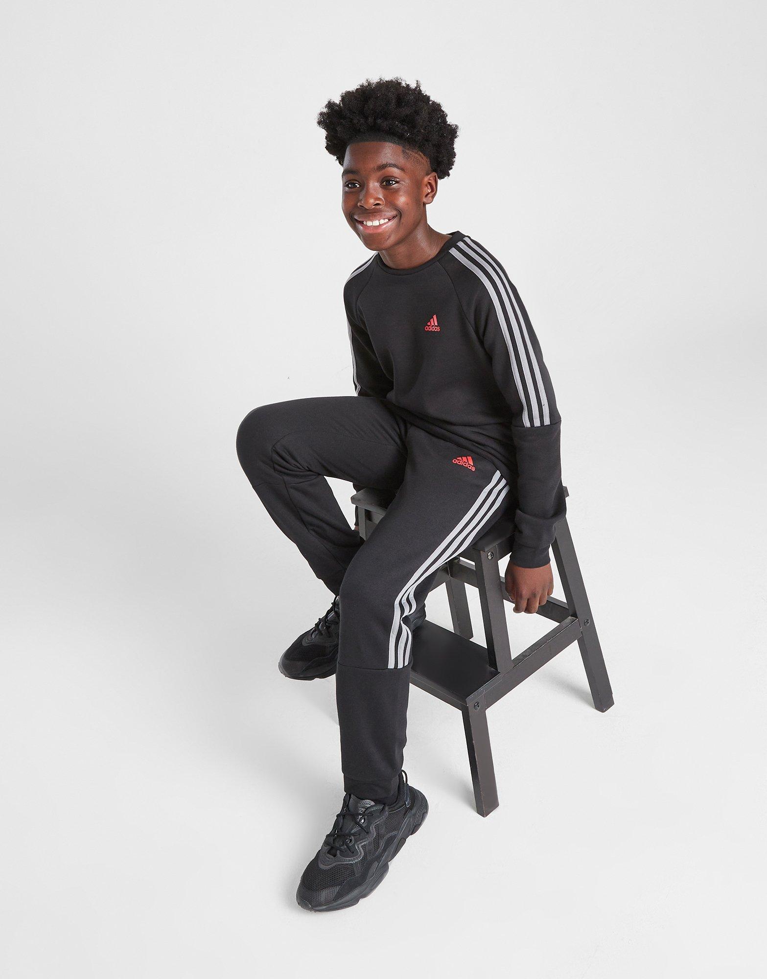 Suit up when the weekend hits with this juniors' Energize 3-Stripes Tracksuit from adidas. Exclusive to JD, this two-piece suit is made from a soft poly-cotton blend that uses recycled polyester fabric. It comes in a Black colourway and features a crew neck sweatshirt with raglan sleeves, as well as matching joggers with an elasticated waistband for a custom feel. With contrasting 3-Stripes to the sleeves and legs, this tracksuit is finished up with side pockets and a Badge of Sport logo in red. Machine washable. | JI7503