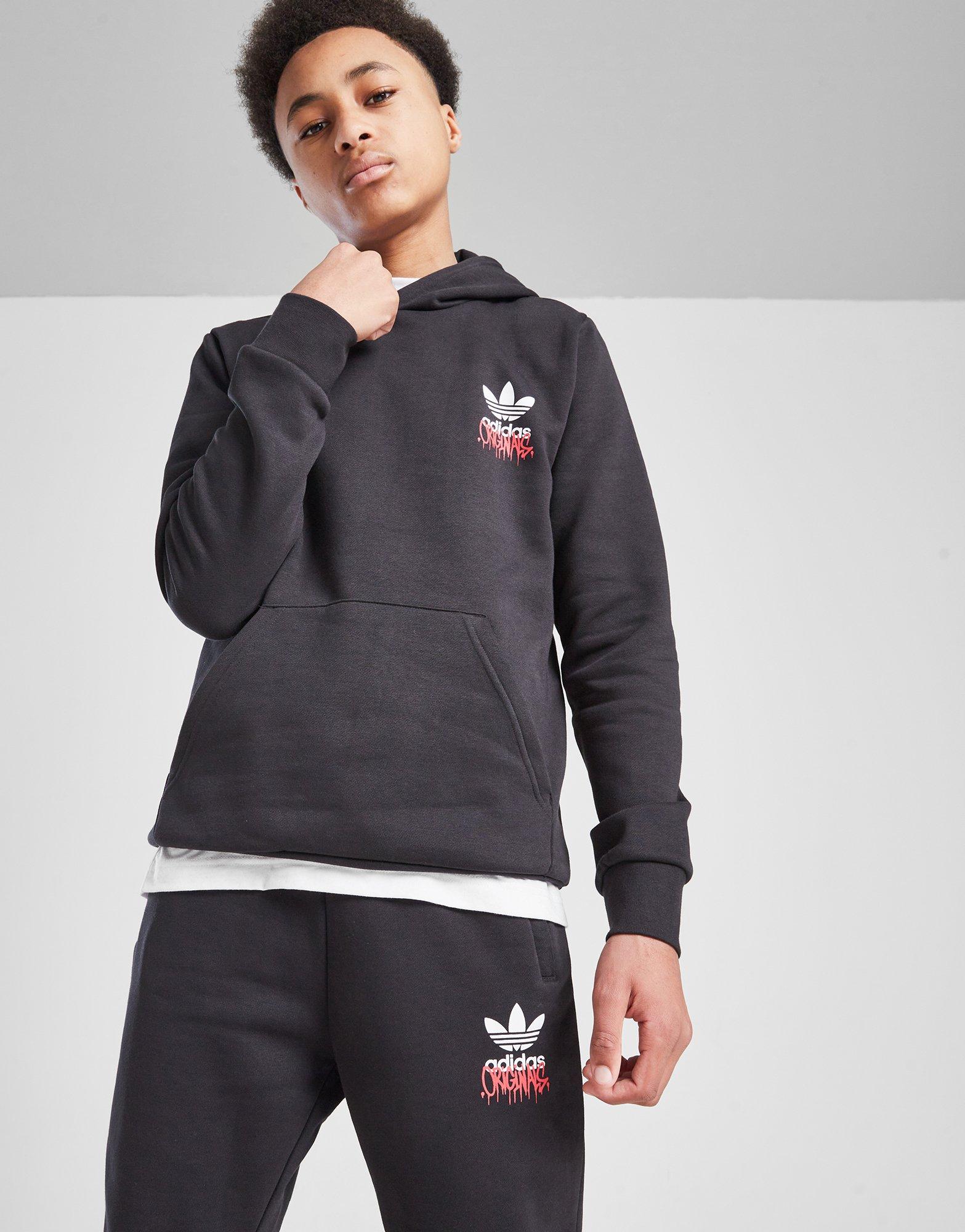 Bring a fresh feel to your off-duty 'fits with these juniors' Graffiti Trefoil Joggers from adidas Originals. In a Black colourway, these JD-exclusive joggers are made with a super-soft blend of cotton and recycled poly fleece for lasting comfort. They feature an elastic waistband with a drawstring to adjust the fit, with cuffed ankles and side pockets. Finished with a graffiti-style adidas Originals Trefoil logo at the thigh. Machine washable. | KE9185