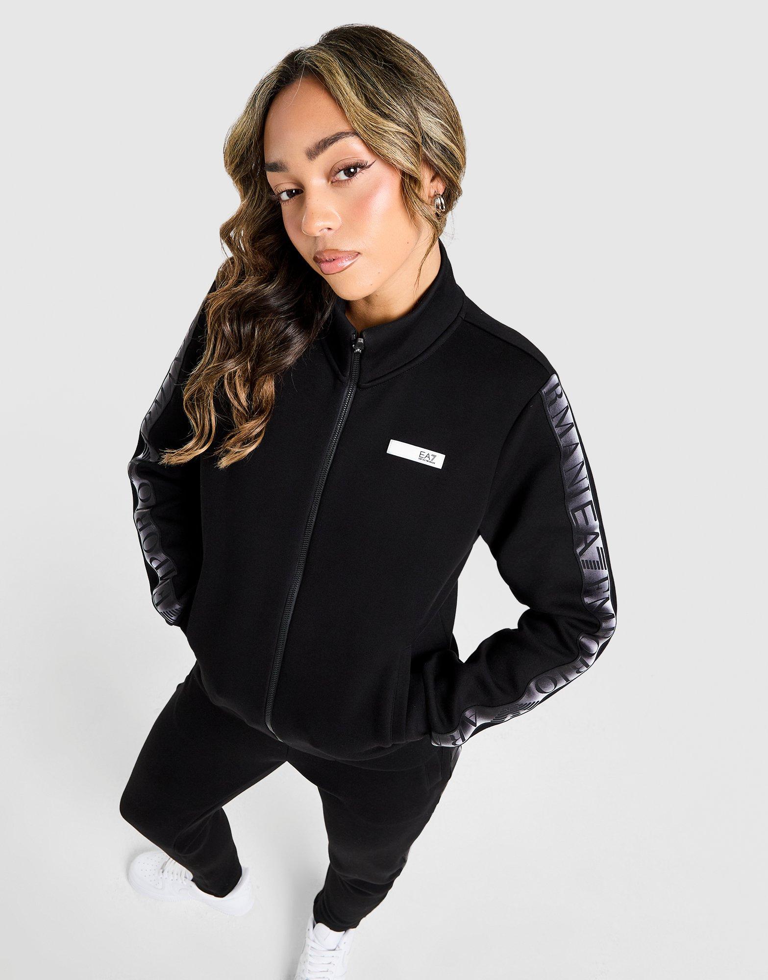 Lowkey style gets a premium upgrade from EA7 Emporio Armani. This women's VENTUS7 Tape Tracksuit lands in black. Natural VENTUS7 technical fabric feels smooth, light and warm. The zipped track top and matching joggers pair together for a complete fit. Finished with silky taping down the sides and repeat branding. Machine washable. | Our model is 5'7" and wears a size S.