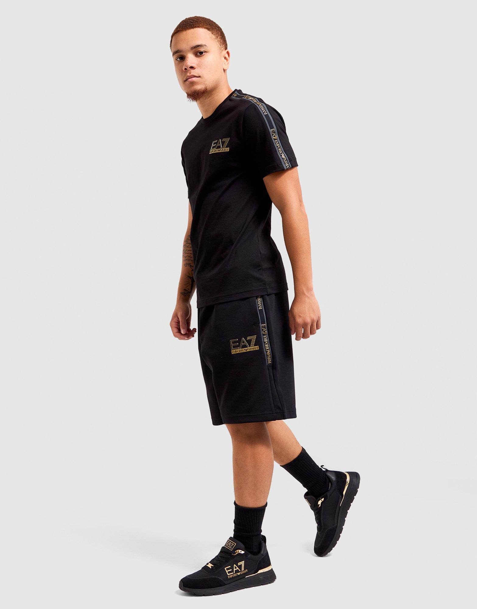 Step up your training game with these men's Ea7 double-knit shorts, exclusive to JD for premium athletic performance. Standard fit design moves with you during high-intensity workouts while maintaining a sharp silhouette. Black colourway with grey and gold tape detailing adds a sporty, contemporary edge. Double-knit construction offers enhanced durability and moisture-wicking properties to keep you dry and focused. Ea7 excellence engineered for the dedicated athlete.