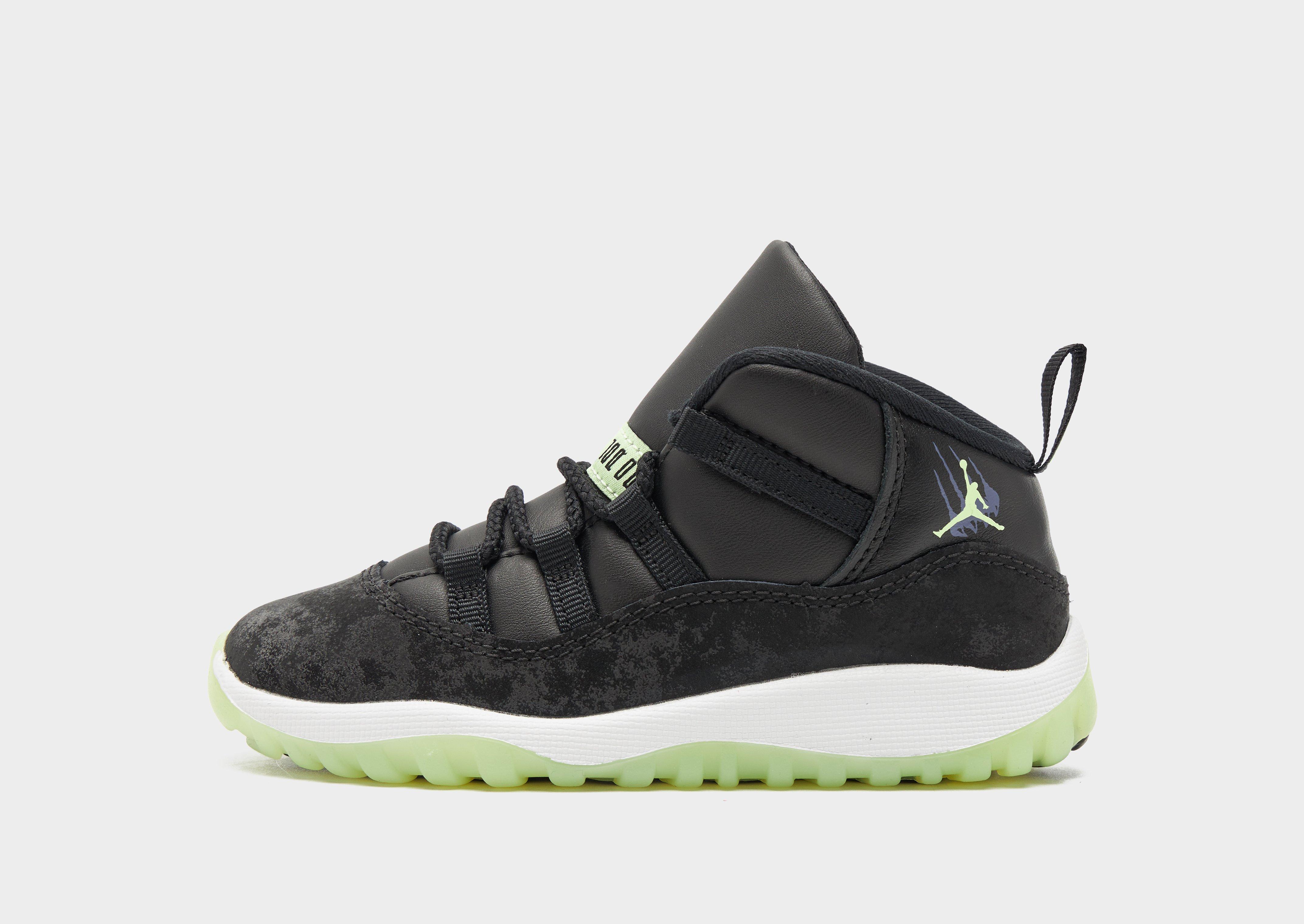 Get a legendary look with these infant's Air 11 Retro sneakers from Jordan. Coming in a Black colourway with Green glow in the dark details, these low-profile shoes have a light, breathable textile upper with patent leather for a premium look. They feature a lace fastening with a padded ankle collar for a snug, secure fit and a composite shank for supportive wear. Underfoot is a foam midsole with a Nike Air-Sole unit for responsive cushioning whilst the rubber outsole delivers total traction. Signed off with the Jumpman logo to the tongue and heel. Style Code: IB1380-001