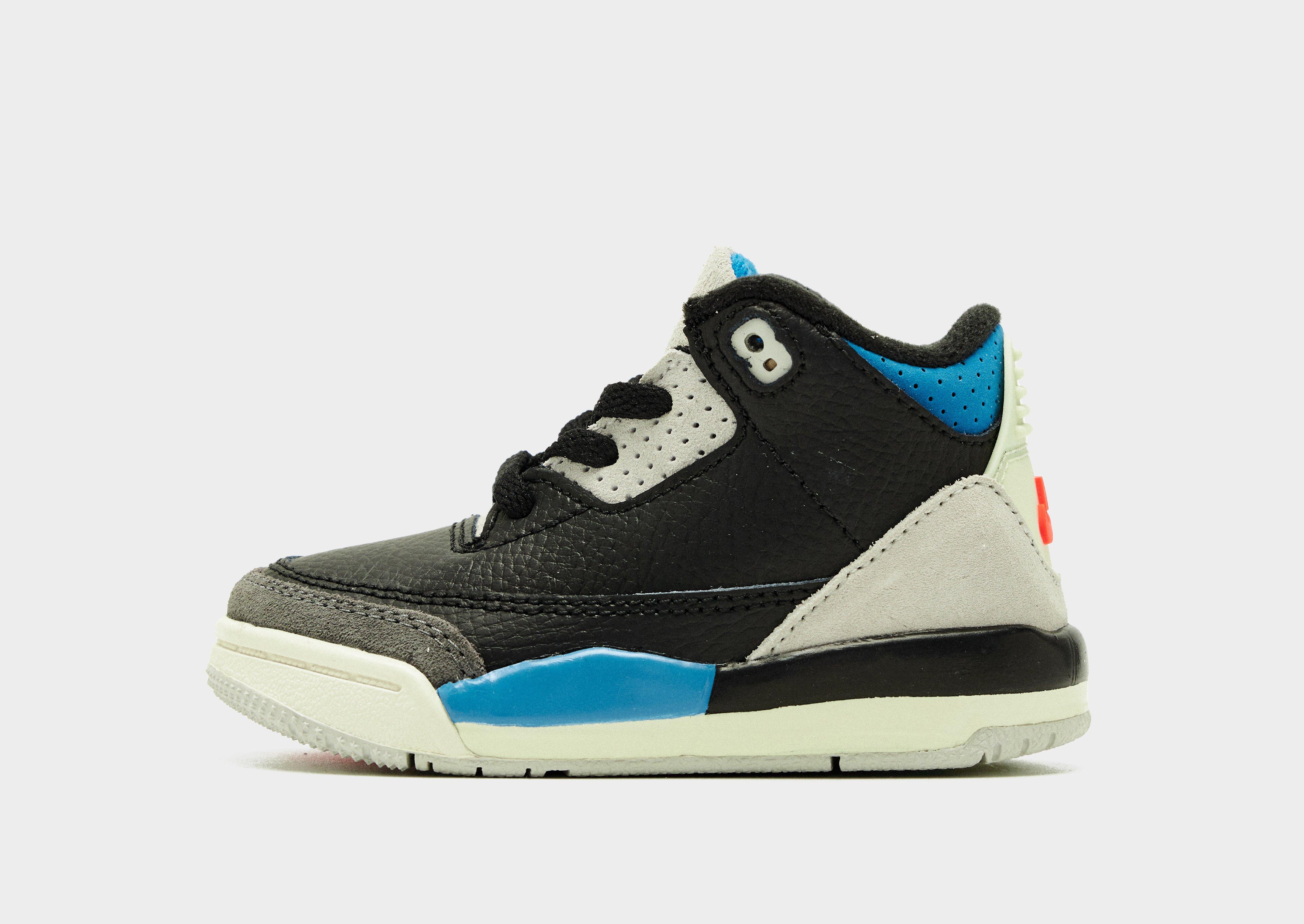 Add a sneaker icon to your sneaker collection with the Air Jordan 3. First introduced in ’88, the AJ3 not only marked the debut of the legendary Jumpman logo, but also introduced the visible Air cushioning and iconic elephant print detailing. The AJ3 remains a symbol of greatness, blending heritage with innovation. Coming in a Black colourway with Blue details, these infant's mid-top shoes have a premium leather upper that reps Jordan's iconic elephant print across the overlays. They feature a tonal lace up fastening and a padded ankle collar for long-lasting comfort. Underfoot, these shoes are sat on a flexible foam midsole, which keeps feet supported, while visible Air cushioning levels up the comfort. With a grippy rubber tread, they're finished up with Nike Air branding to the heel and the iconic Jordan Jumpman logo to the tongue.” Style Code: IB8966-004