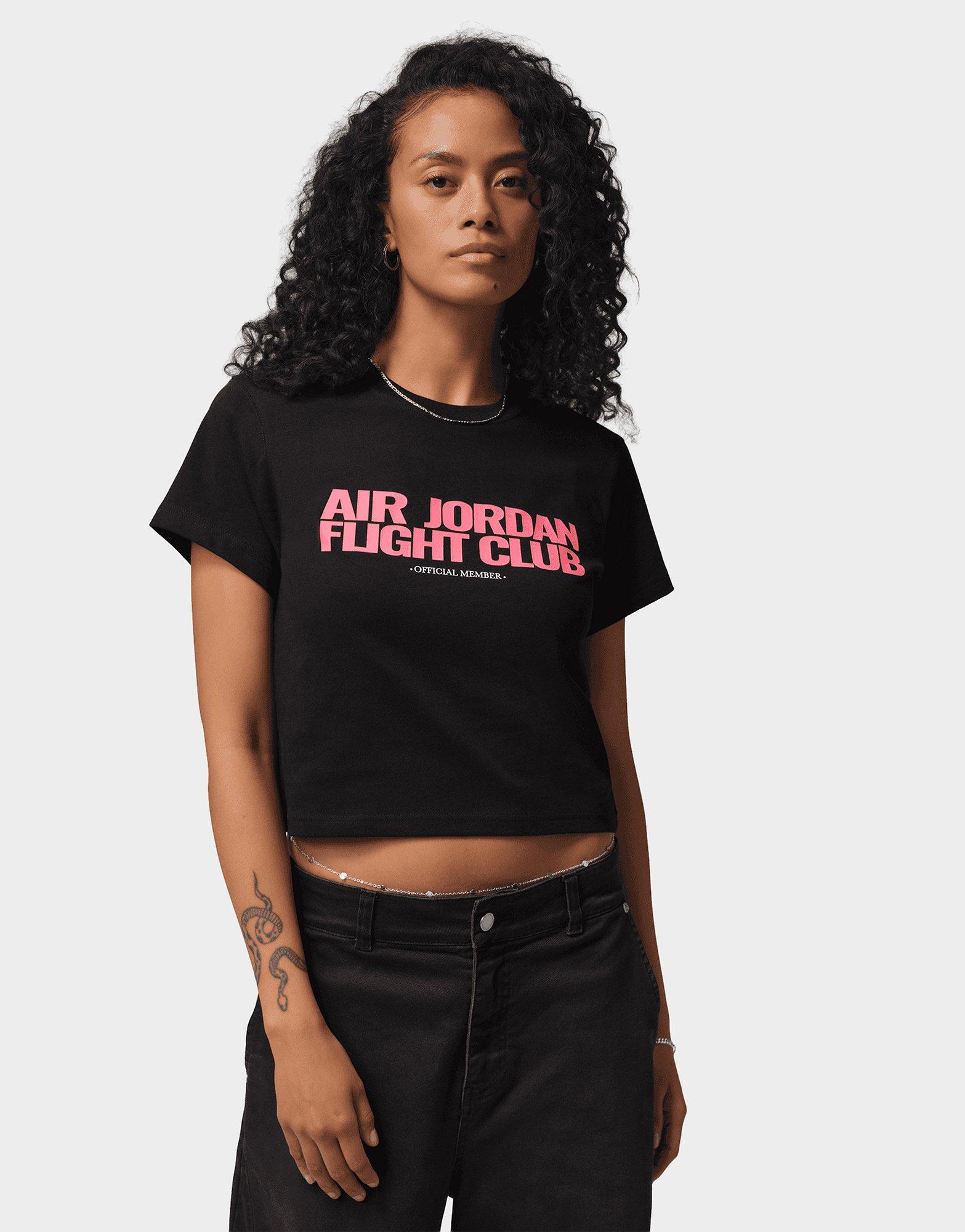 Make a statement with this women's Jordan Cropped AJ Flight Club Graphic T-Shirt. Designed with a standard fit and crop length, it features Flight Club graphics in black with red accents. The cropped silhouette pairs perfectly with high-waisted bottoms for on-trend athletic looks. Built with Jordan quality and bold basketball-inspired branding, this tee brings iconic style to modern streetwear. Style Code: IF3572-010
