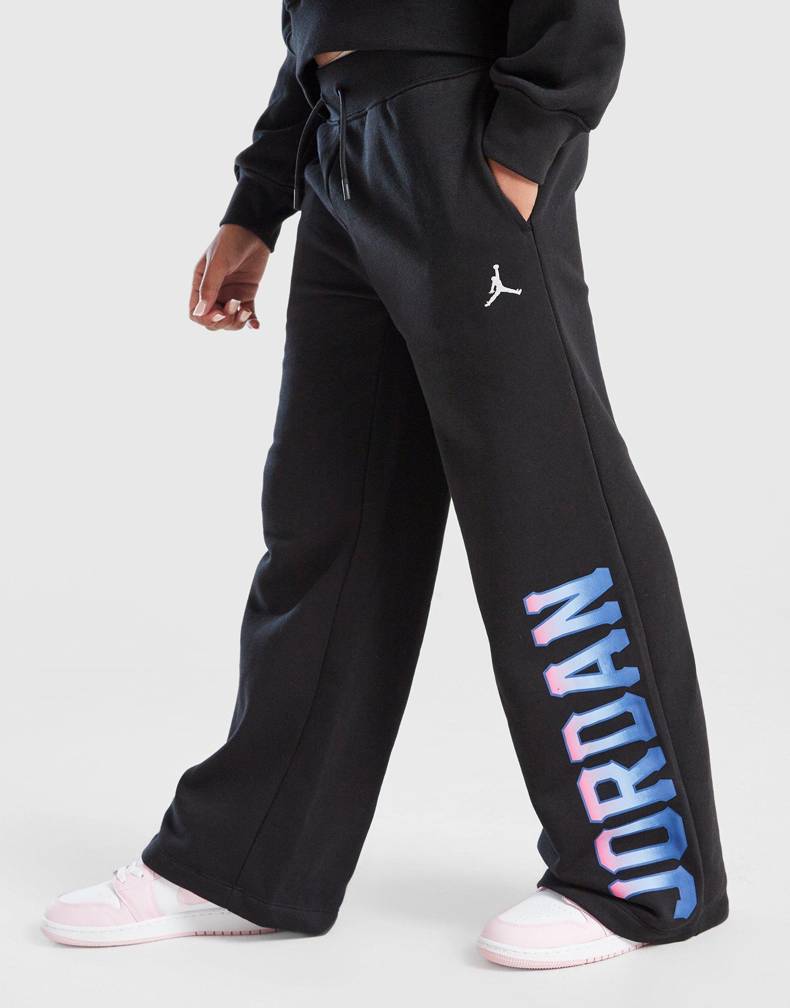 Collegiate style. Only at JD. Looking for weekend comfort? These junior girls' Fade Wide Leg Joggers are the one. Jordan's nailed it with a stretchy waistband you can adjust, as well as side pockets. As well as the iconic Jumpman, these pants have Jordan branding to the leg. Machine washable.