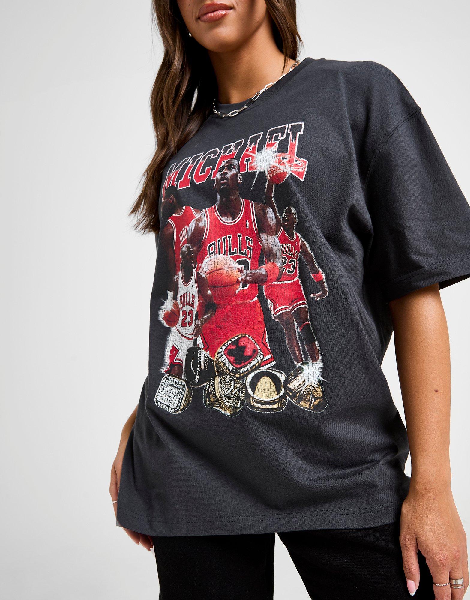 Relive the championship legacy with this women's Mixtape Graphic T-Shirt from Jordan. In an Off Noir colourway, this oversized top is made from soft, lightweight cotton. Featuring a crew neckline, dropped shoulders and an extended hem, it's finished off with the MJ six rings graphic on the chest and the Jumpman to the nape. Machine washable. | Our model is 5'7" and wears a size S.
