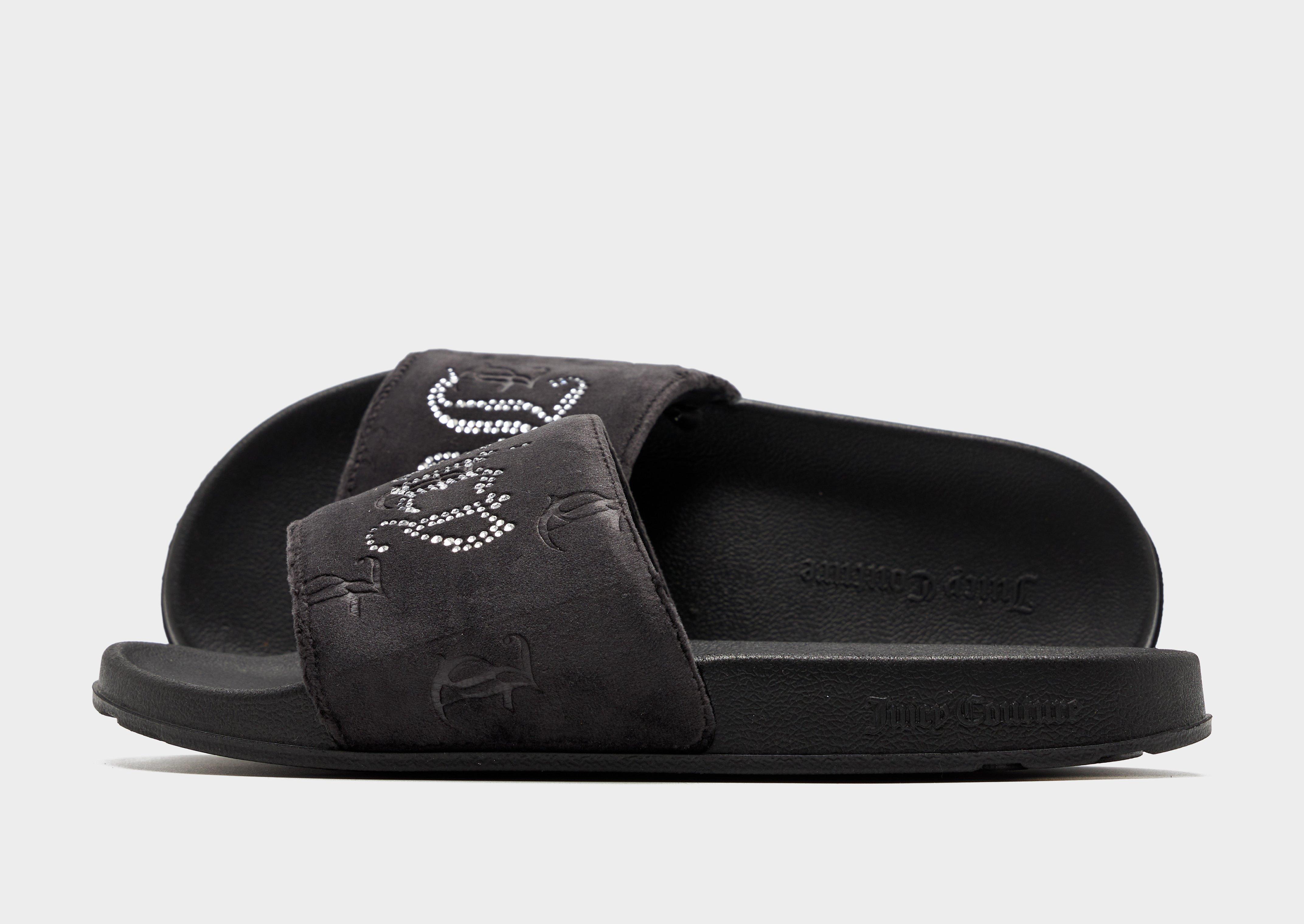 Elevate your laidback look with these women's Donna Slides from Juicy Couture. Landing in a Black colourway, these slip-on slides have a Velour top strap with padded lining for a plush fit. Underfoot, the cushioned, moulded footbed delivers a comfy ride, while the textured outsole adds essential grip. Finished off with signature diamante Juicy Couture branding across the strap. Style Code: JCFYL225006101