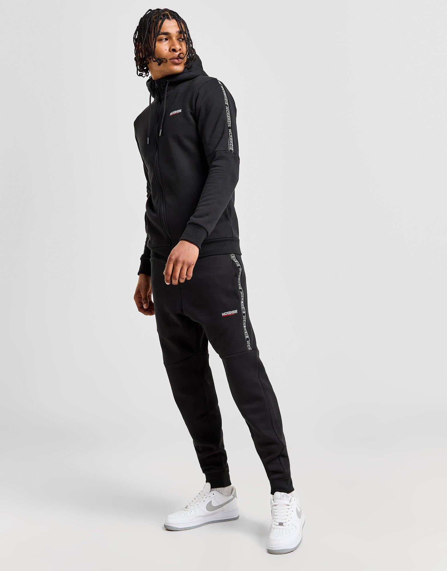 Freshen up your off-duty looks with these men's Essential Tape Joggers from McKenzie. In a Black colourway, these regular-fit sweatpants are made with a soft cotton-blend fleece for lasting comofort. They have an elastic waistband with a drawstring to adjust the fit, and stretchy ribbed ankle cuffs for a secure fit. They have side pockets for easy storage, and are finished with tape detailing to the sides with repeat McKenzie branding, and a classic logo to the thigh. Machine washable. | Our model is 6'2" and wears a size medium.