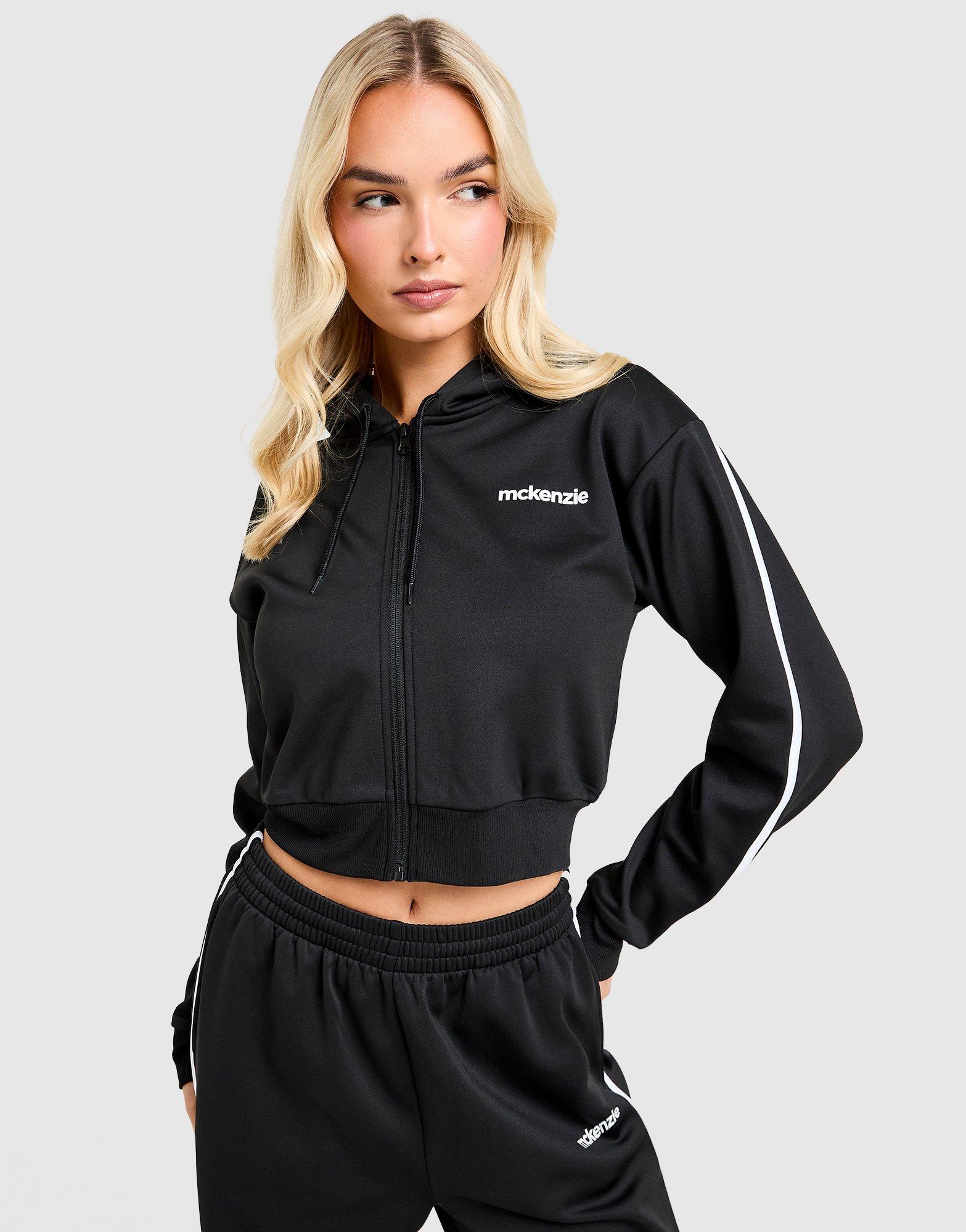 Exclusive to JD. Pull on a fresh layer with this women's Nova Crop Poly Hoodie from McKenzie. In a Black colourway with White panels down the sleeves, this cropped hoodie has stretchy ribbed trims to the hem and cuffs. It's made from a soft polyester knit fabric that delivers a tapered fit. Finished off with a drawcord-adjustable hood and signature McKenzie wordmark branding. Machine washable. | Our model is 5'8.5" and wears a size S.