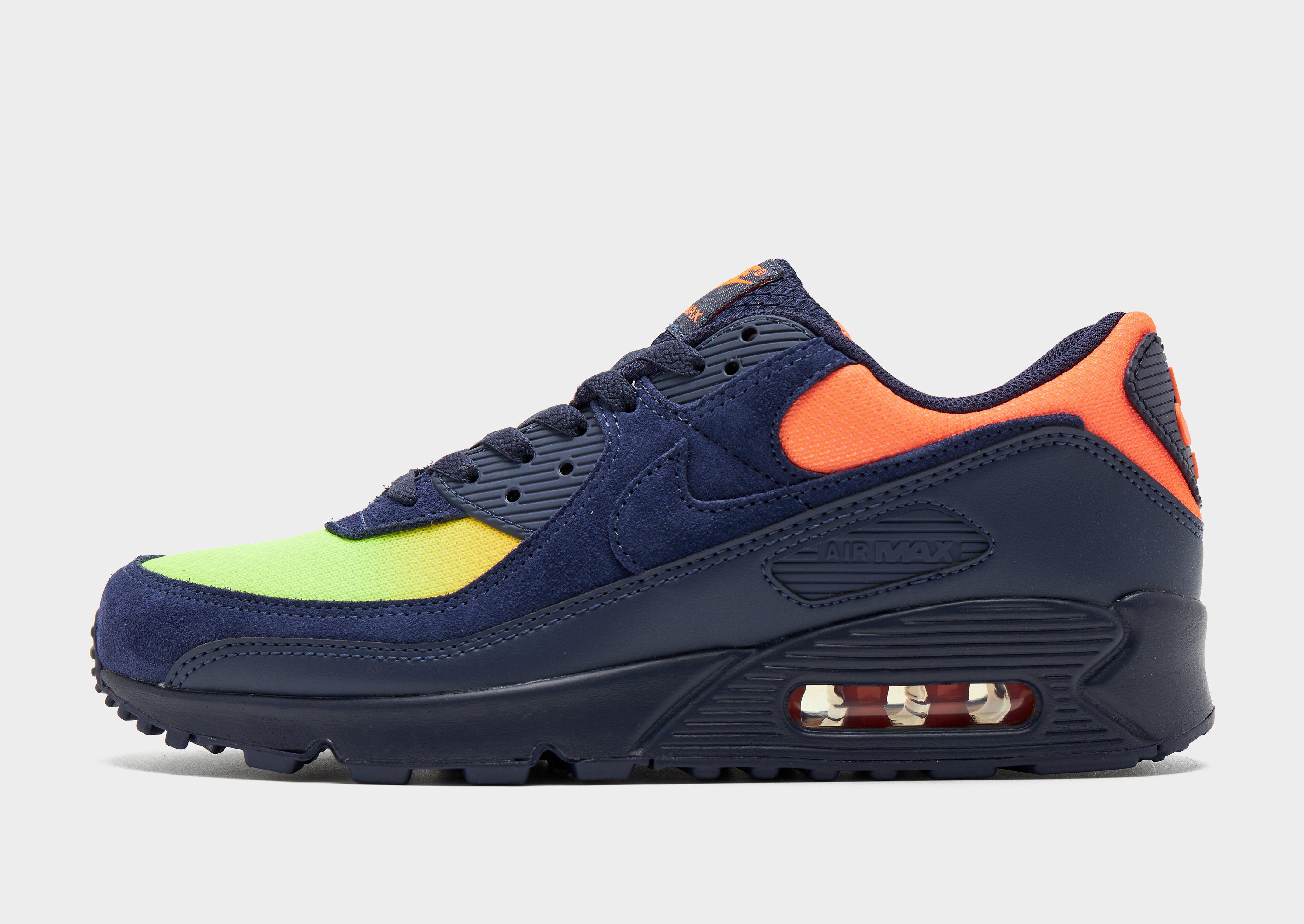 Giving Tinker Hatfield's '90 OG an upgrade, these men's Air Max 90 shoes from Nike are streetwear essentials. In a Navy colourway with gradient Yellow and Orange details, these sneakers are built with a premium leather upper for supreme support. Keepin' the same design lines as the classic, a tonal lace-up fastening keeps you locked in and a lightweight midsole with a visible Air unit in the heel brings a smooth ride and essential cushioning. With a grippy rubber tread underfoot, these shoes are finished with Air Max branding and a Swoosh to the sidewalls. Style Code: DM0029-700