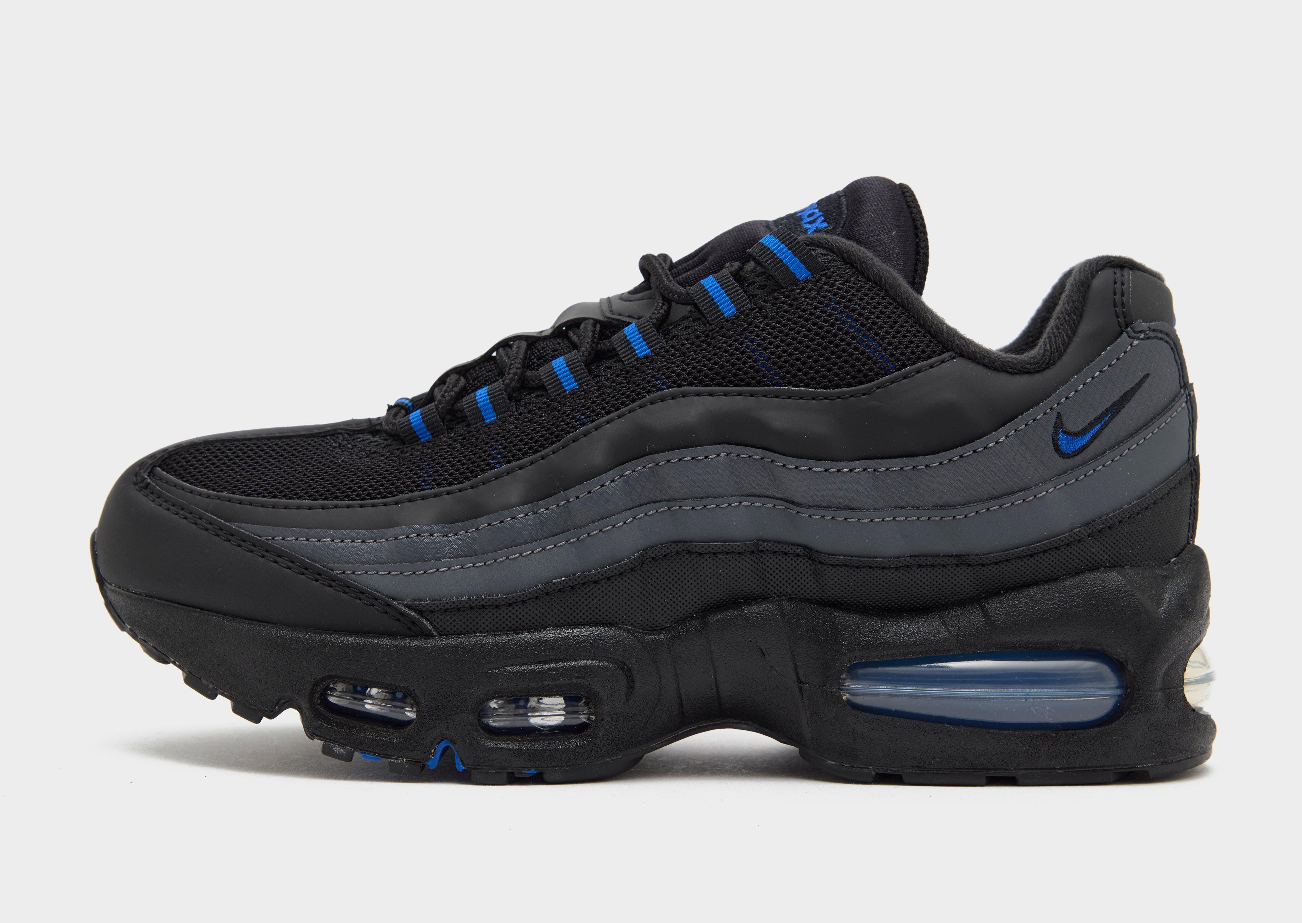 Step out in a Swoosh OG with these junior's Air Max 95 shoes from Nike. Landing in a Black colourway with Royal Blue details, these JD-exclusive sneakers have airy mesh through the upper with real and synthetic leather for lasting wear. With stitched overlays to create the iconic wavy design lines, they have a lace fastening with a low-cut, padded ankle collar for a secure fit. They have visible Air units underfoot to cushion every step, with flex grooves in the midsole for a natural step. They have a tough rubber outsole for grippy traction, and are signed off with iconic Nike branding throughout. Style Code: IM6032-010