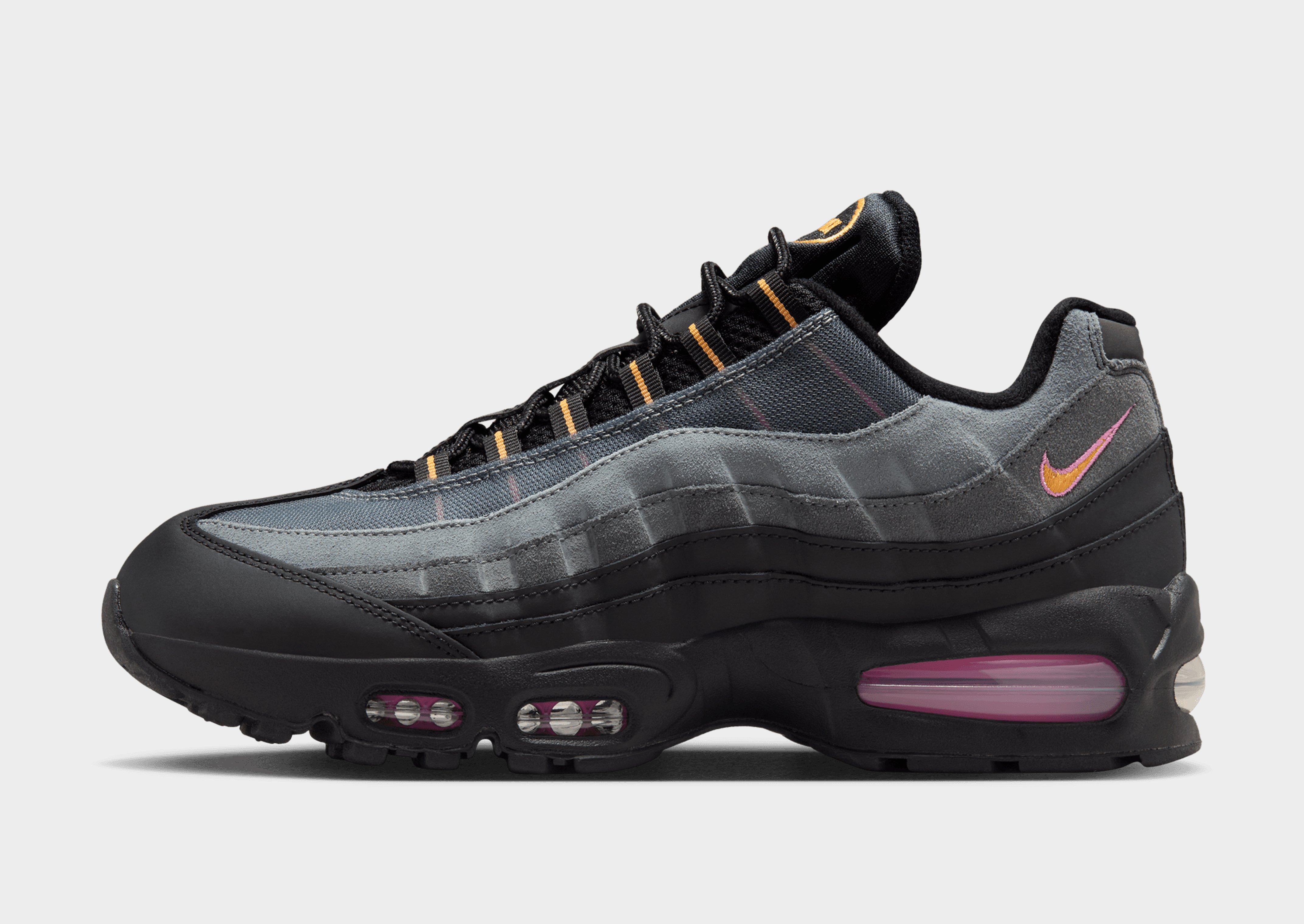 Step out in a Swoosh OG with these women's Air Max 95 shoes from Nike. Landing in a Black colourway with Pink details, these JD-exclusive sneakers have airy mesh through the upper with real and synthetic leather for lasting wear. With stitched overlays to create the iconic wavy design lines, they have a lace fastening with a low-cut, padded ankle collar for a secure fit. They have visible Air units underfoot to cushion every step, with flex grooves in the midsole for a natural step. They have a tough rubber outsole for grippy traction, and are signed off with iconic Nike branding throughout. Style Code: IB7683-001W
