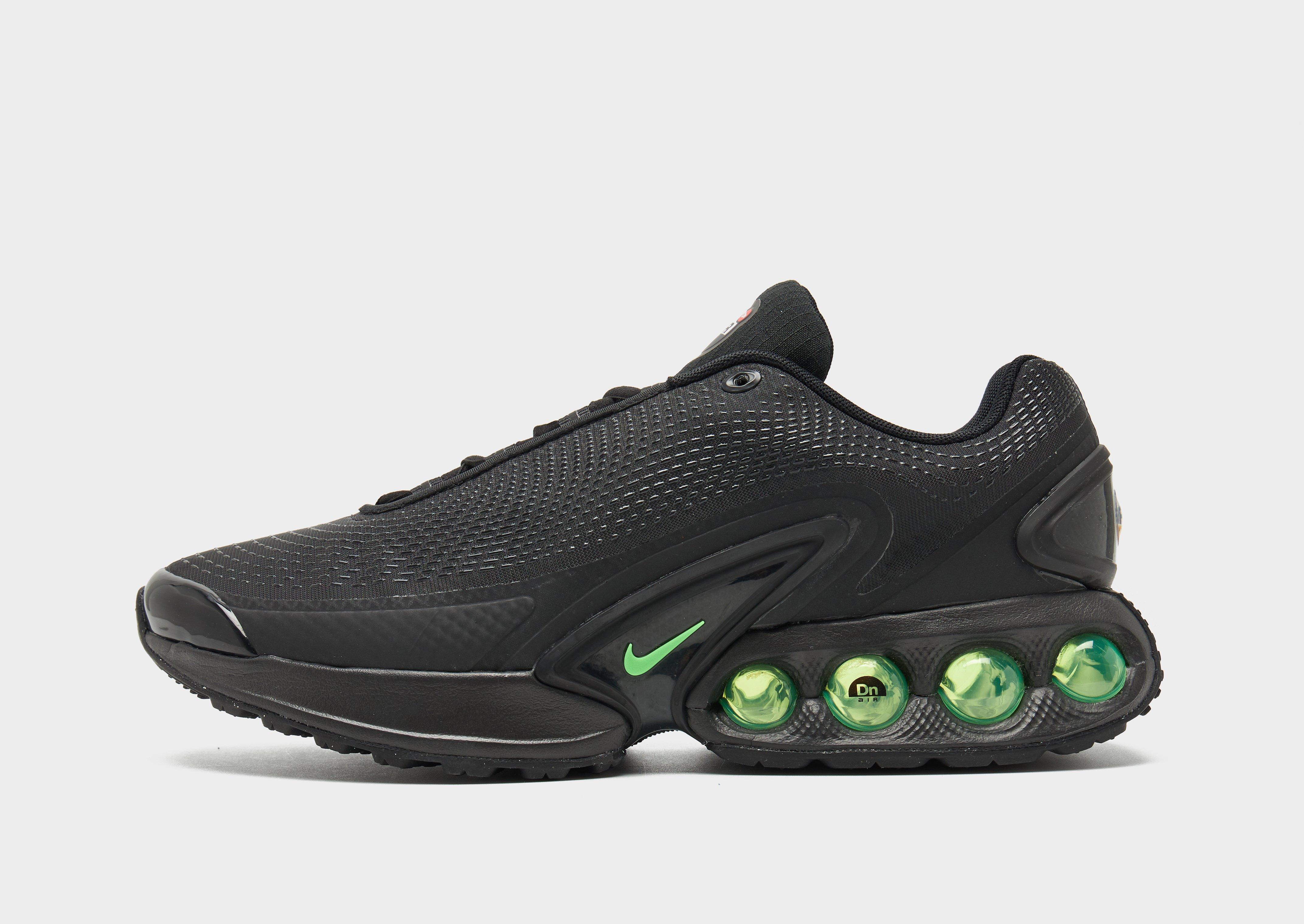 Feel the unreal with every step in these men's Air Max Dn shoes from Nike. In a Black colourway with Green details, these revolutionary sneakers have a multilayered mesh upper with a haptic print. They feature matte synthetic accents for support, while the plush foam midsole surrounds the cushioning system for added comfort. Stealing the show, the Dynamic Air unit system features two sets of dual-pressure tubes that shift air levels from the firmer heel to the softer tubes towards the forefoot. With a solid rubber outsole to contain that extra energy, these shoes are finished off with signature Swoosh and Air Max logos. Style Code: DV3337-021