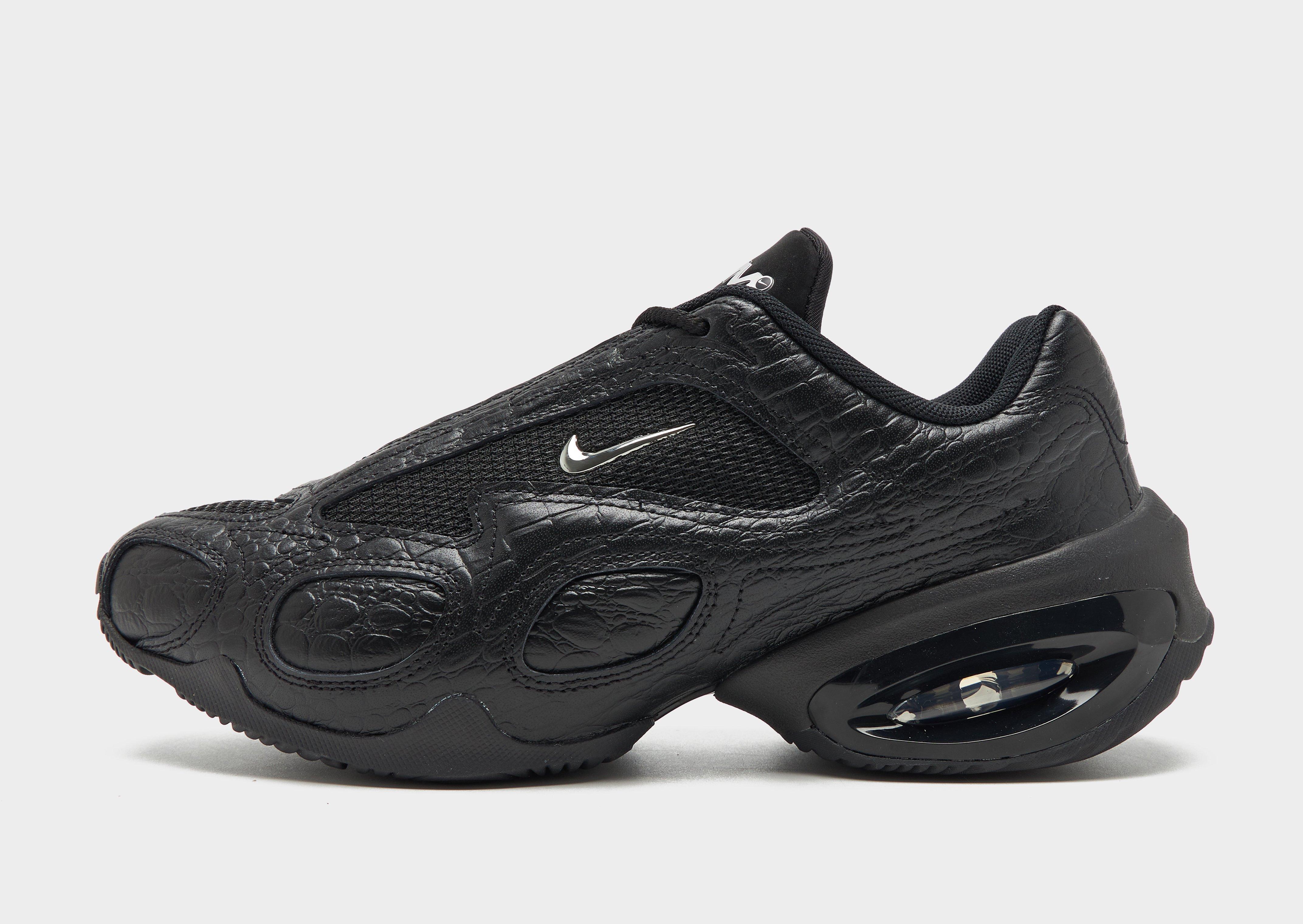 A bold entry has landed in the Air Max line-up. Grab your pair of these women's Air Max Muse trainers from Nike. In a Black colourway, the sleek, shiny and structured faux crocodile-skin upper pairs synthetic leather and mesh panels. Underfoot, the foam midsole has an exaggerated arch, with Max Air cushioning delivering a responsive ride. Finished off with a solid rubber outsole and Air Max branding. Style Code: IB6689-001