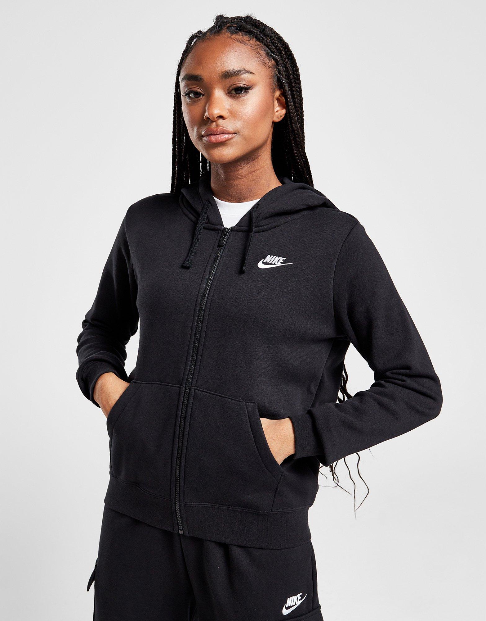Zip up in an off-duty staple with this women's Club Full Zip Hoodie from Nike. In a Black colourway, this full zip layer is made from the brand's signature Club Fleece for super-soft, fleecy comfort. It has a drawcord-adjustable, three-panel hood for coverage, while stretchy ribbed trims add shape to the fit. With side pockets for your essentials, this hoodie is finished off with contrasting Nike Futura branding to the chest. Machine washable. | Our model is 5'7" and wears a size small.