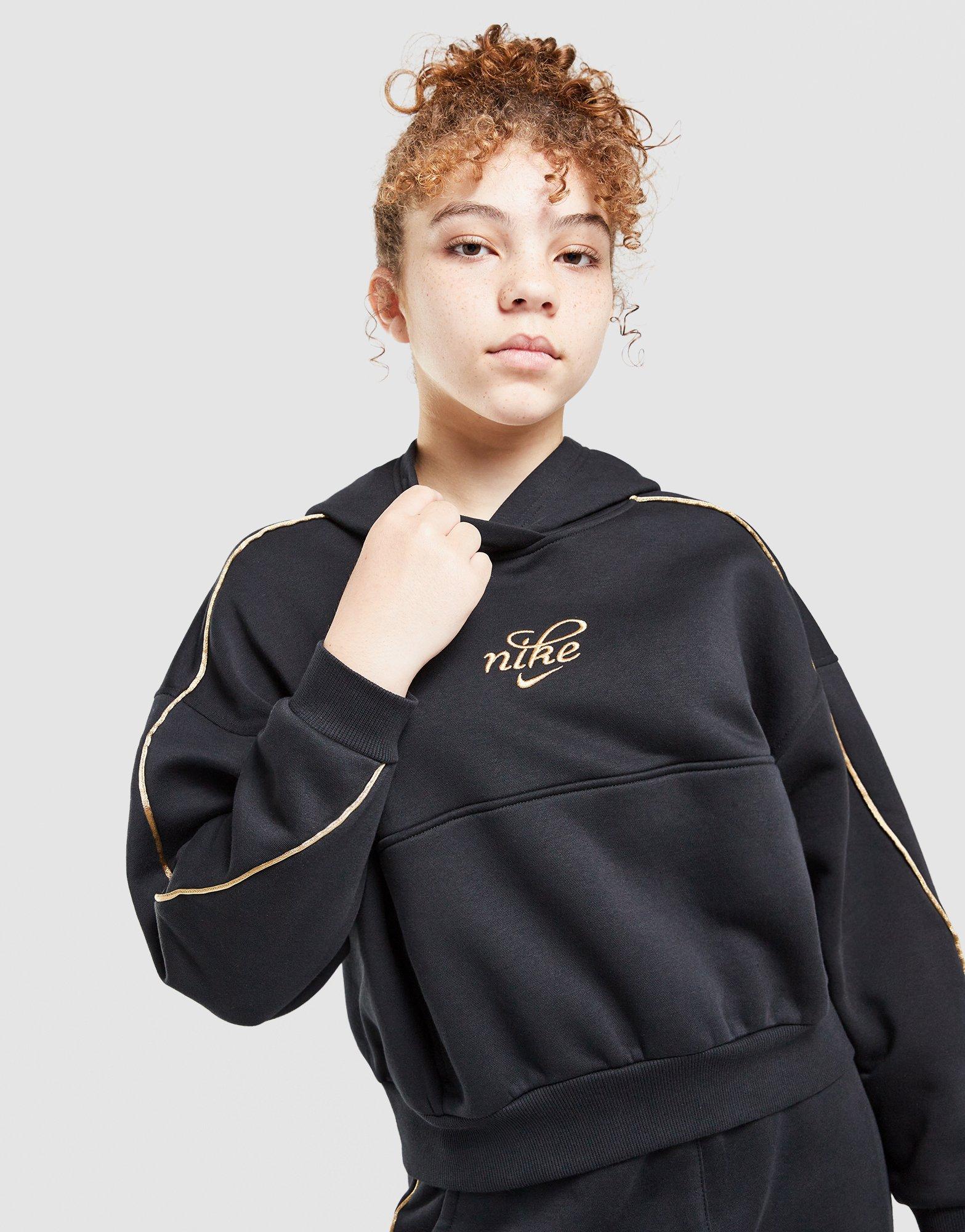 Your new everyday fave. This junior girls' Graphic Hoodie from Nike is cut from soft fleece fabric. It has a pullover hood for coverage. Ribbed trims to hold the shape. With a boxy fit for a roomy feel. Finished with Nike branding to the chest. Machine washable.
