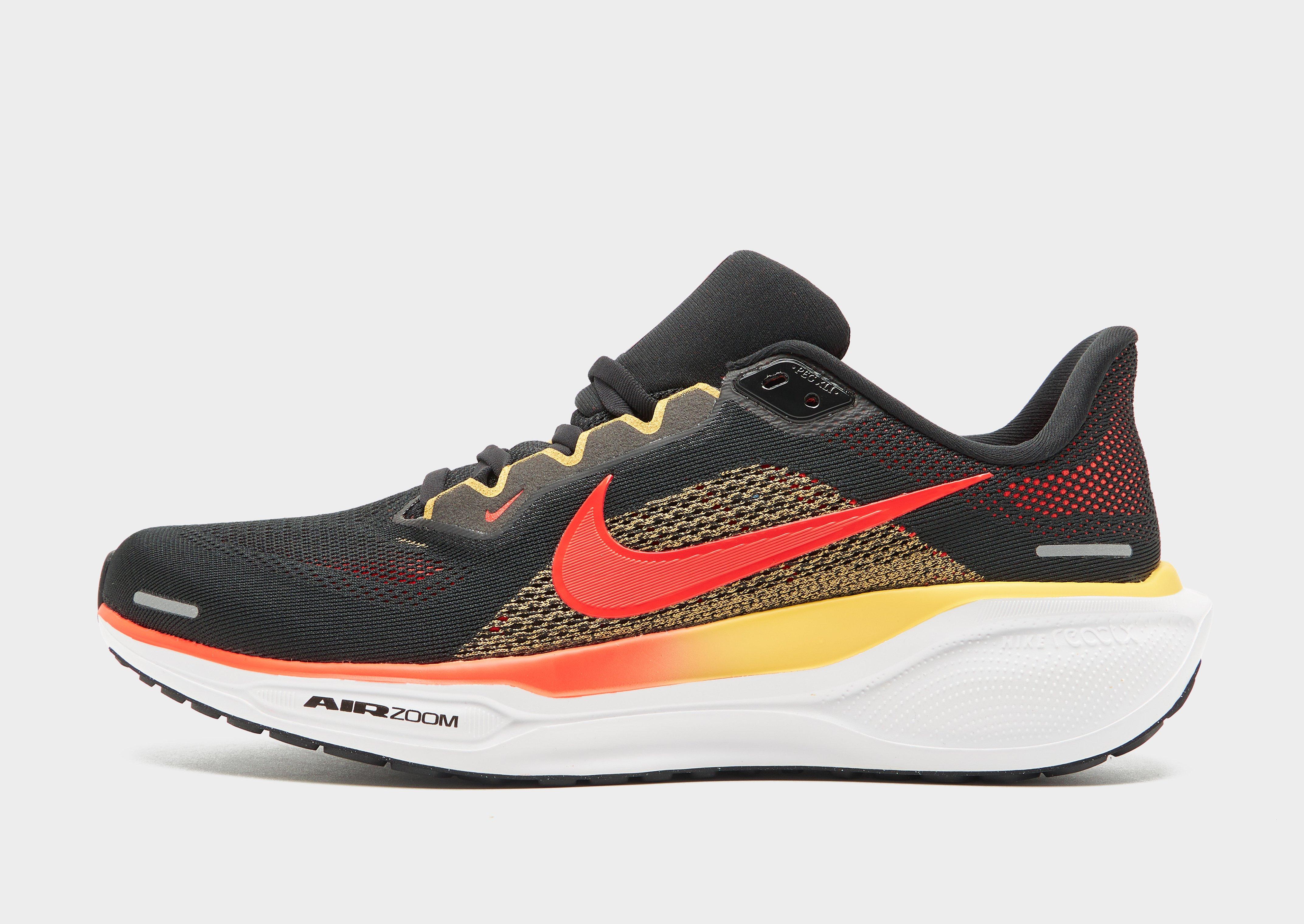 Get moving with these men's Pegasus 41 running shoes from Nike. Landing in a Black colourway with Red details, these runners have a breathable mesh upper to keep your feet cool when you're striding for PBs. They feature a lace fastening to secure the fit, and a low-cut padded ankle collar to keep you feeling snug. Underfoot, a partly recycled ReactX foam midsole works with dual Air Zoom units to provide responsive cushioning, while the rubber outsole ensures you're gripped to the surface. Perfect for those beginning their running journey, experts, or for everyday wear. Signed off with the Swoosh to the sidewalls. Style Code: FD2722-016