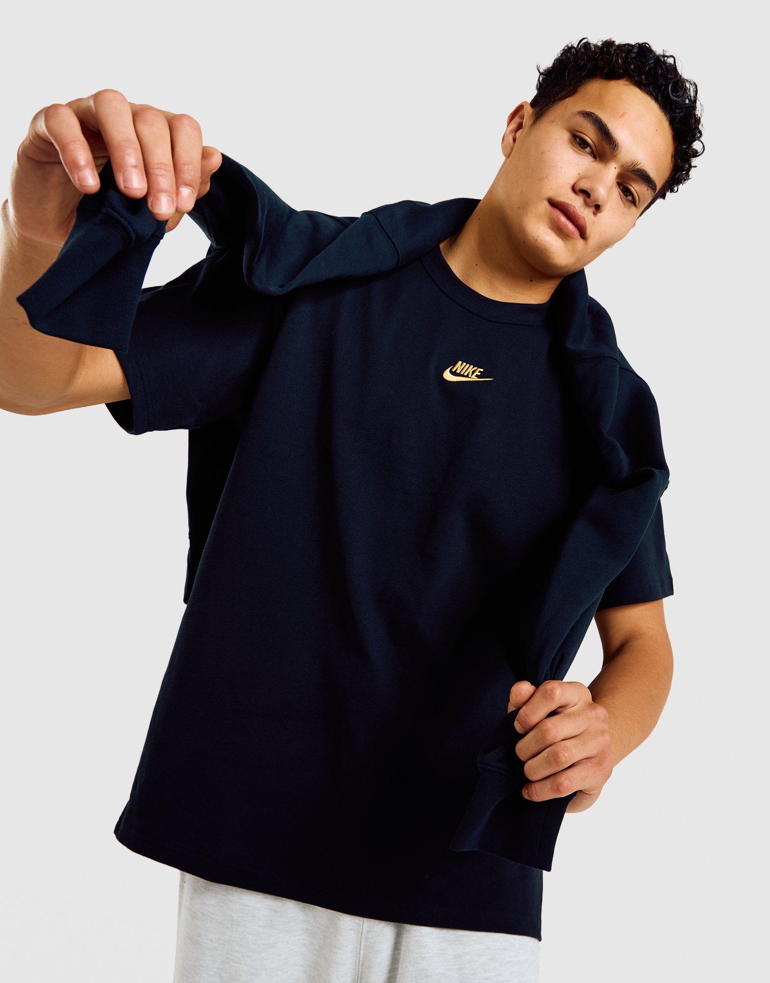 Keep your cut clean with this men's Premium Club T-Shirt from Nike. In a Black colourway, this loose fit tee is made from heavyweight cotton fabric that's made with at least 75% organic cotton fibers. It features a classic crew neckline and short sleeves. Finished up with signature Nike branding embroidered in Gold to the chest for an elevated look.