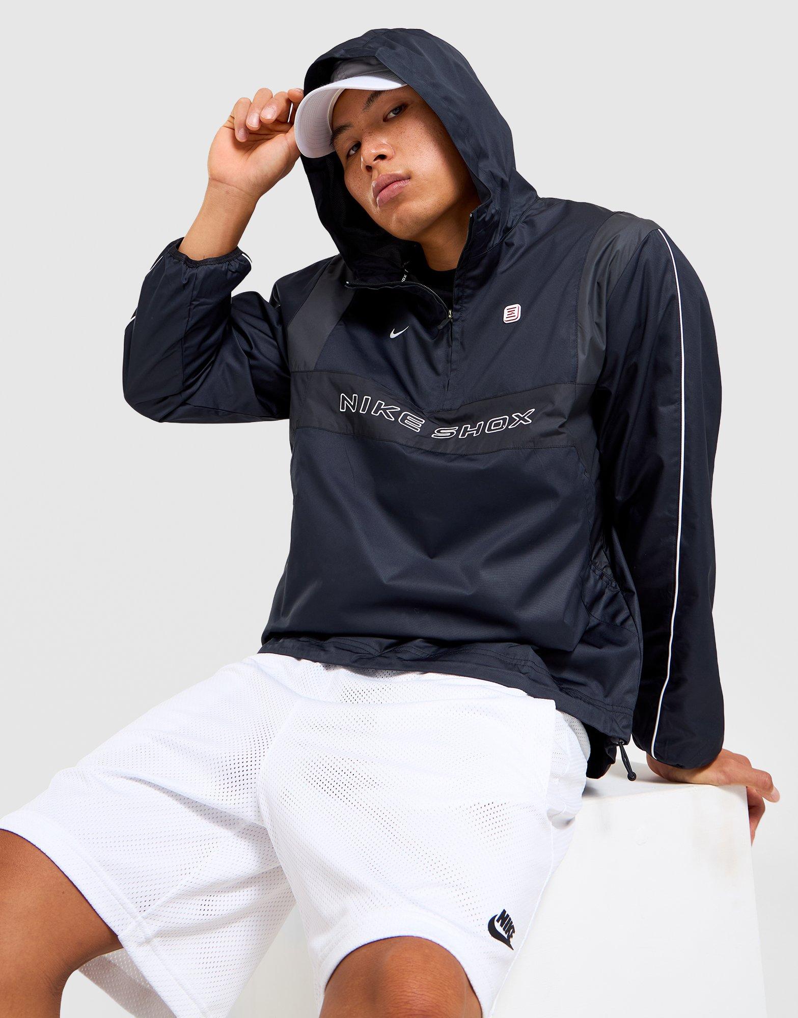 Rep noughties energy in this men's Nike Shox 1/2 Zip Jacket. In black, this light layer's made with smooth woven fabric that's wind and water-resistant. It's got a half zip fastening and an adjustable hood for extra cover when you need it. The elastic cuffs and bungee cord through the hem let you secure the fit. Finished up with signature Nike Shox branding. Machine washable. | Our model is 6'1" with a 36" chest and wears a size M.