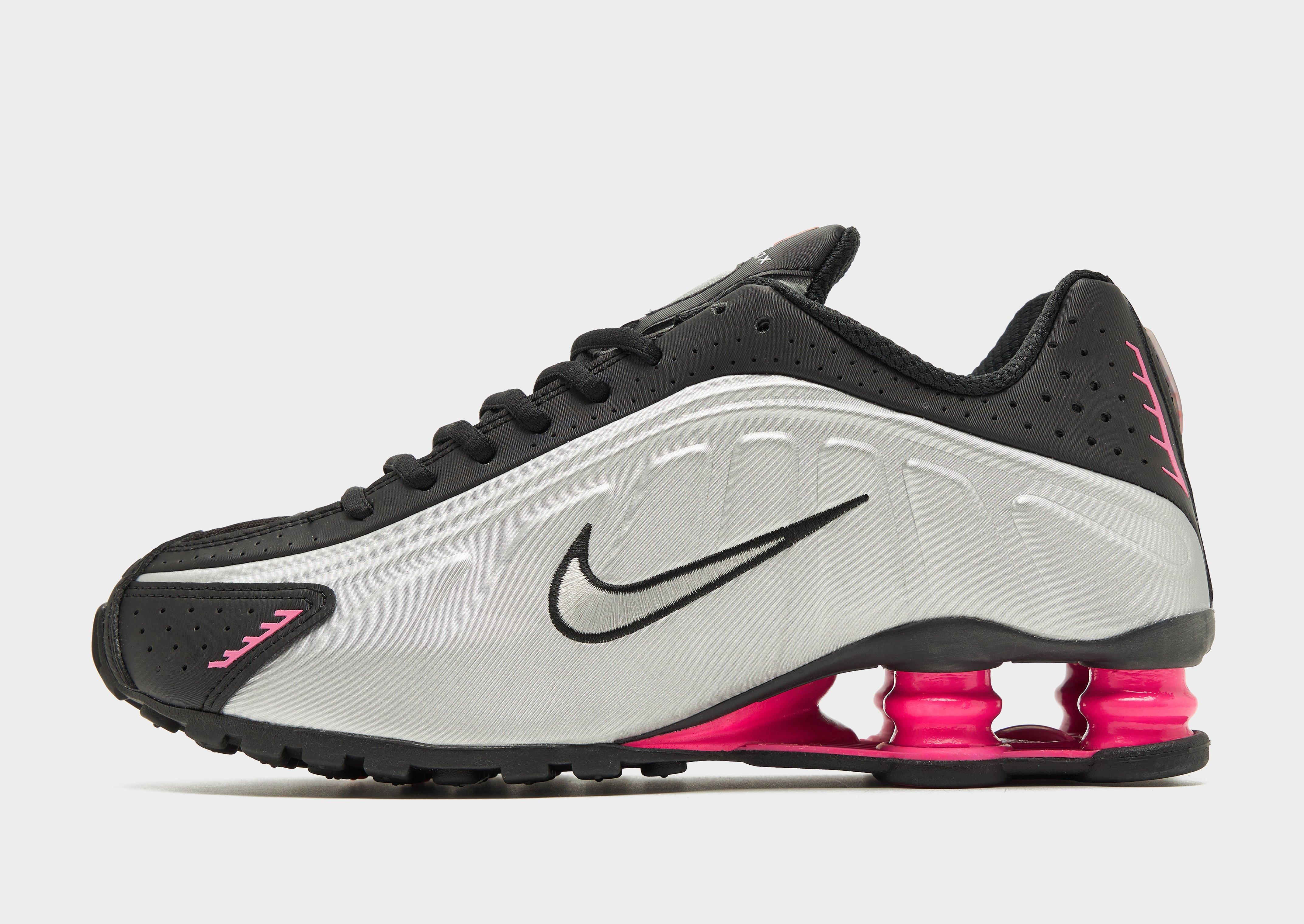 Retro but futuristic, these women's Shox R4 sneakers from Nike bring back the 2003 icon in its OG form. In a Black colourway with Silver details, these statement shoes are built with a breathable mesh upper that features glossy TPU overlays and a tonal lace up fastening for a locked-in fit. Nike's iconic Shox tech sits underfoot, with a full-length midsole of springy Shox columns for a super comfy feel. With a grippy rubber sole, these trainers are finished with Shox branding to the tongue and the signature Swoosh logo embroidered to the sidewalls. Style Code: AR3565-012