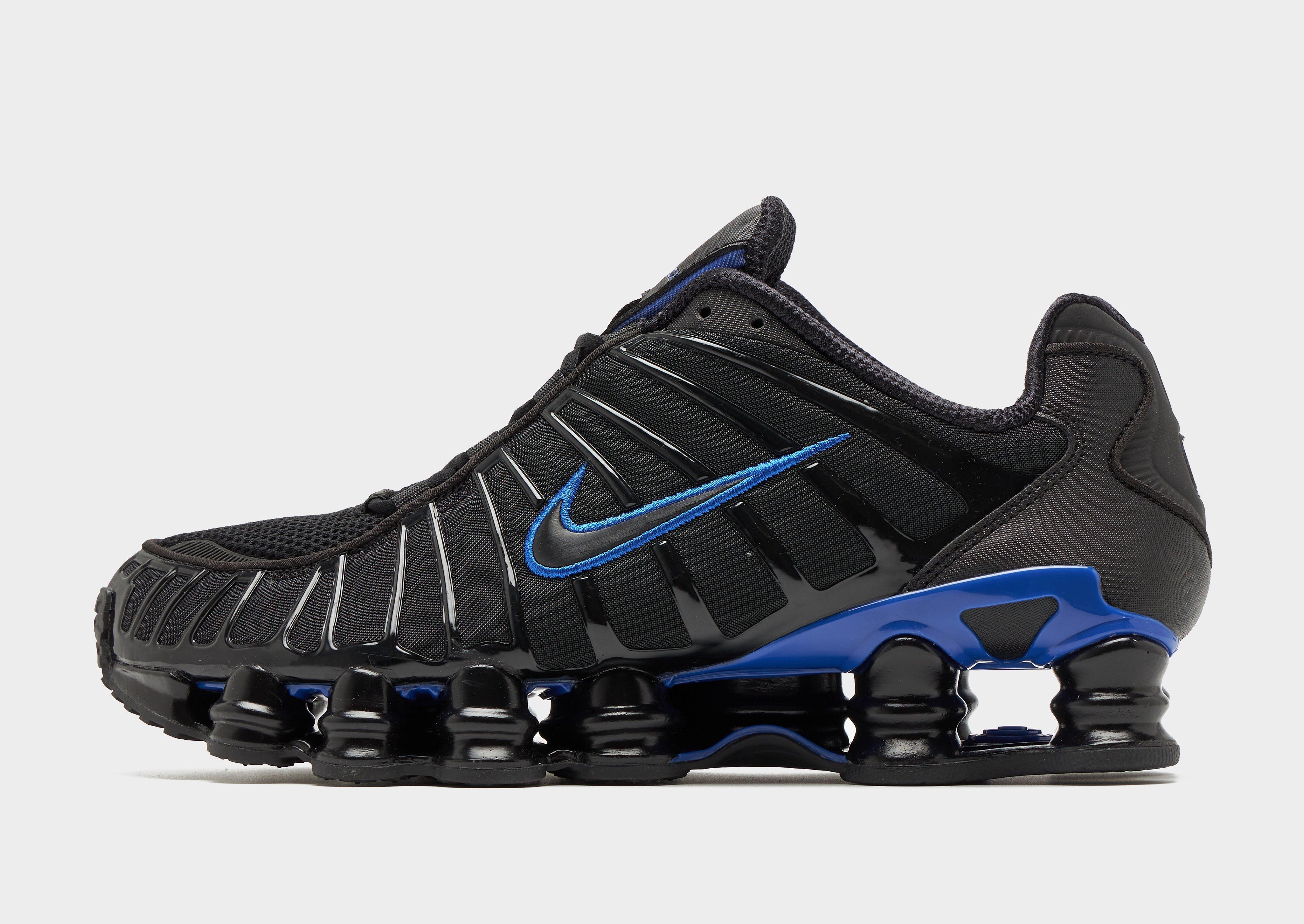 Mechanical cushioning gets stepped up a level with these men's Shox TL trainers from Nike. In a stealthy black colourway, these sneakers refresh the 2003 OG with a breathable mesh upper and a tonal TPU cage with a glossy finish. They feature a secure lace up fastening for a locked-in fit, as well as a shaped collar for a natural feel. Sat on a lightweight foam midsole, these trainers are equipped with Nike's unmissable Shox technology, which is flexible columns of cushioning for a smooth ride. With a grippy rubber tread, these trainers are finished with Racer Blue detailing, Shox branding to the tongue and heel, and the iconic Swoosh logo to the sidewalls. Style Code: AV3595-007