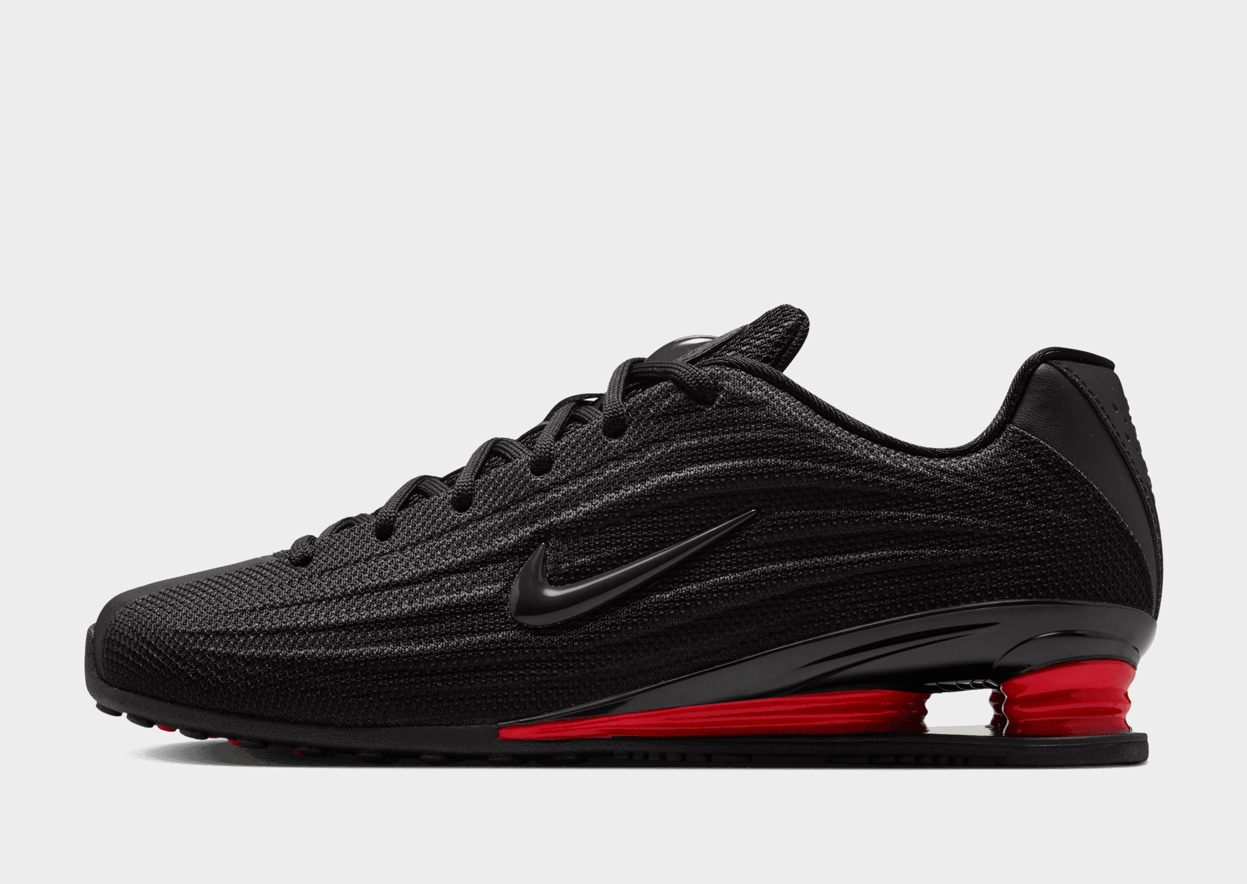 Retro but futuristic, these women's Shox Z sneakers from Nike redefine the classic in a streamlined, lower silhouette. In a Black colourway with Red details, these statement shoes are built with a breathable textile upper that features glossy TPU overlays and a tonal lace up fastening for a locked-in fit. Nike's iconic Shox tech sits underfoot in a lower design, with a full-length midsole of springy Shox columns for a super comfy feel. With a grippy rubber sole, these trainers are finished with Shox branding to the tongue and the signature Swoosh logo embroidered to the sidewalls. Style Code: HQ7540-002