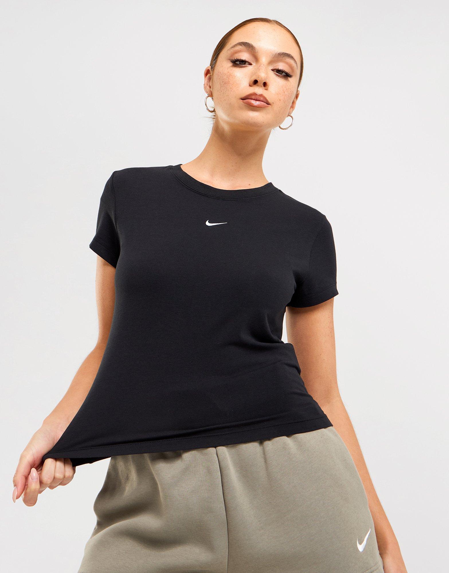 Upgrade your everyday 'fits with this women's Essential Sportswear Chill Knit T-Shirt from Nike. In a Black colourway, this slim-fit tee is made with a super-soft, stretchy knit jersey fabric for lasting comfort. It features a classic crew neckline and short sleeves, and is finished with a signature Swoosh logo at the chest. Machine washable. | Our model is 5'7" and wears a size small.