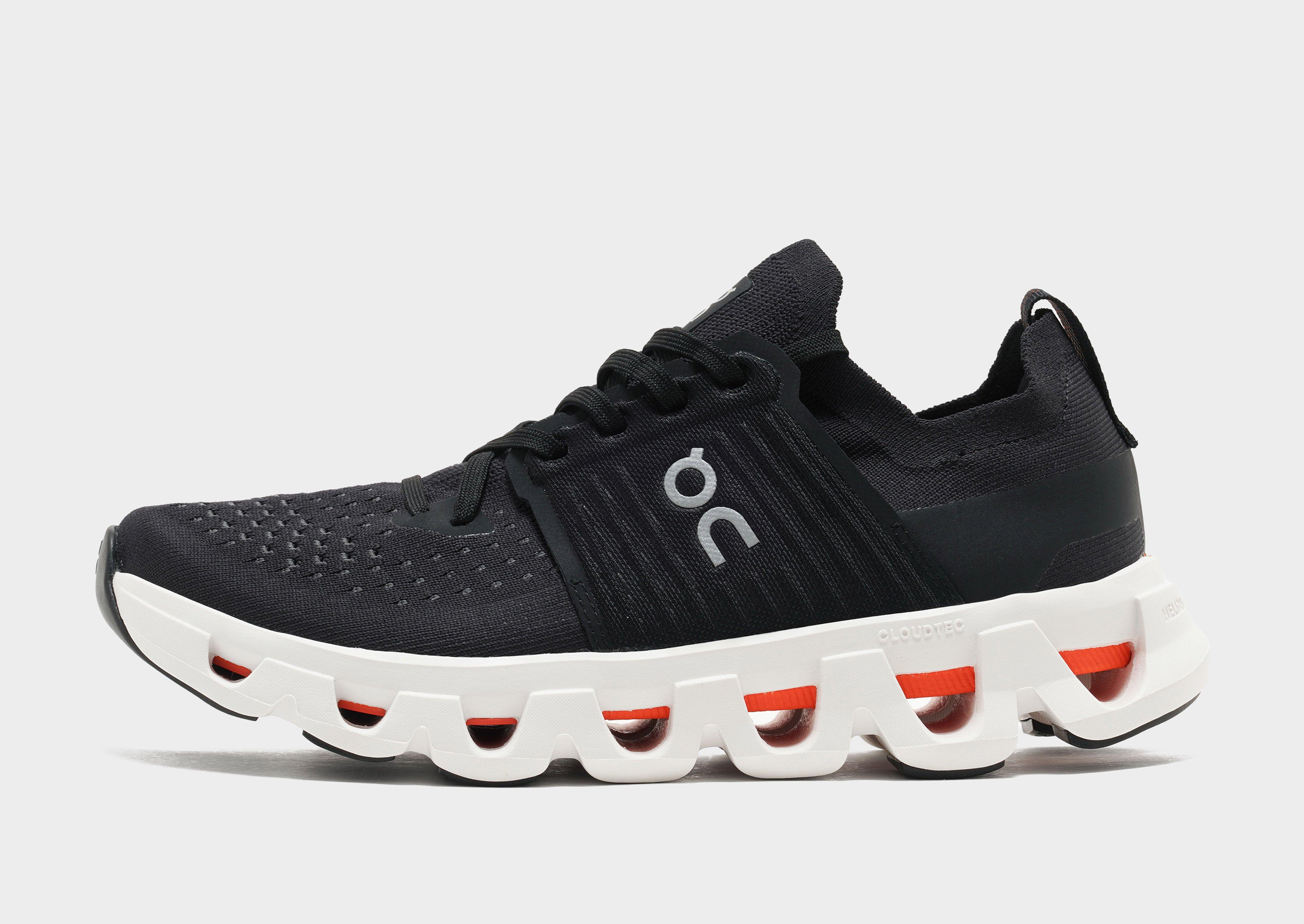 When it's time to hit harder ground, breeze through the city in total comfort with these men's Cloudswift runners from On Running. Landing in a Black colourway with White details, these JD-exclusive urban-built runners have a sock-like upper with breathable mesh zones and 3D heel padding for support. The re-engineered sole combines CloudTec and dual-density Helion superfoam for ultra-soft landings, while the Speedboard injects energy. Finished up with a grippy rubber outsole and signature On Running branding. Style Code: 3MG10960299