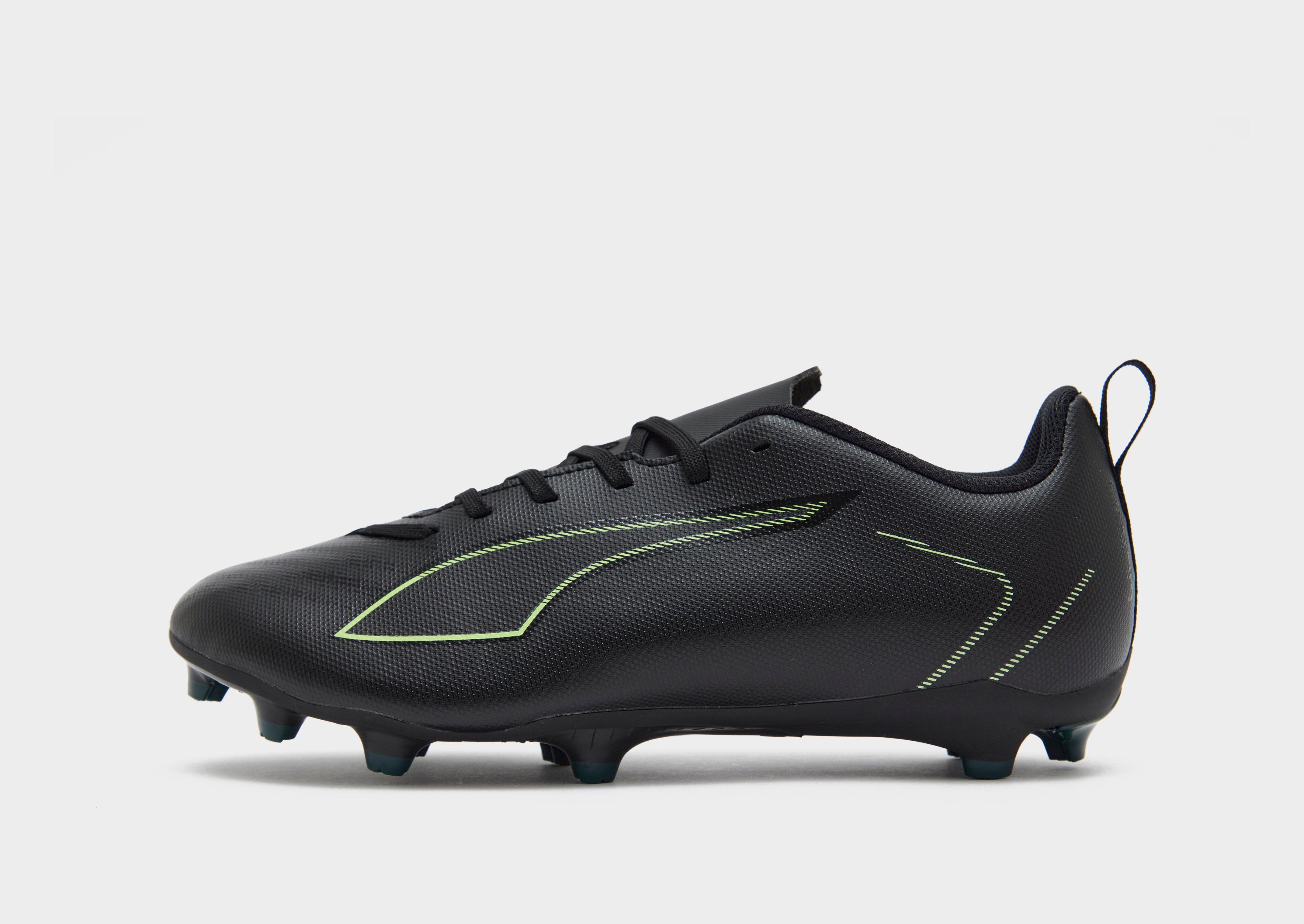 Made for pace. These junior's ULTRA 6 PLAY FG football boots from PUMA land in black with pops of green. They have a light, breathable engineered mesh upper for close ball control. And a support frame for extra stability. Underfoot, they've got a SPEEDSYSTEM outsole and FastTrax studs for total traction. Signed off with signature PUMA branding.