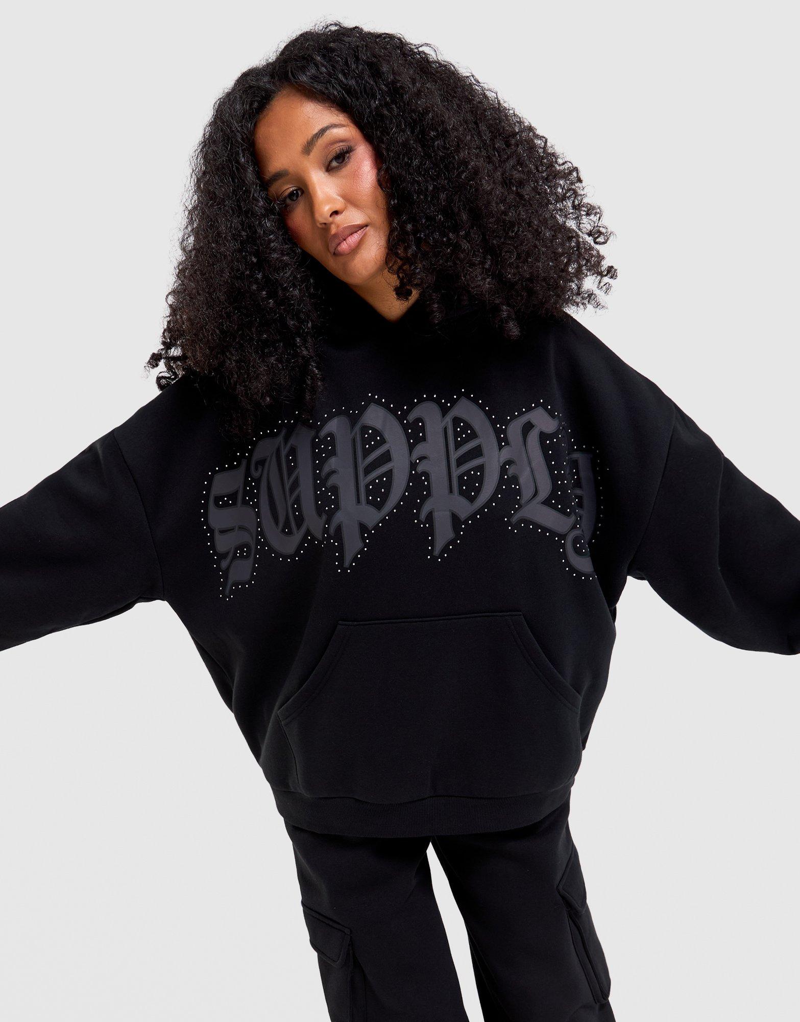 Keep warm in this women's Supply & Demand Oversized Hoodie, exclusive to JD. Featuring an oversized fit with long sleeves and ribbed cuffs, it delivers cozy comfort with a relaxed, contemporary silhouette. The black colourway with silver high brand read detailing adds premium streetwear appeal. Perfect for layering or wearing solo, this hoodie combines everyday versatility with bold branding. Style Code: SUPTW18248007
