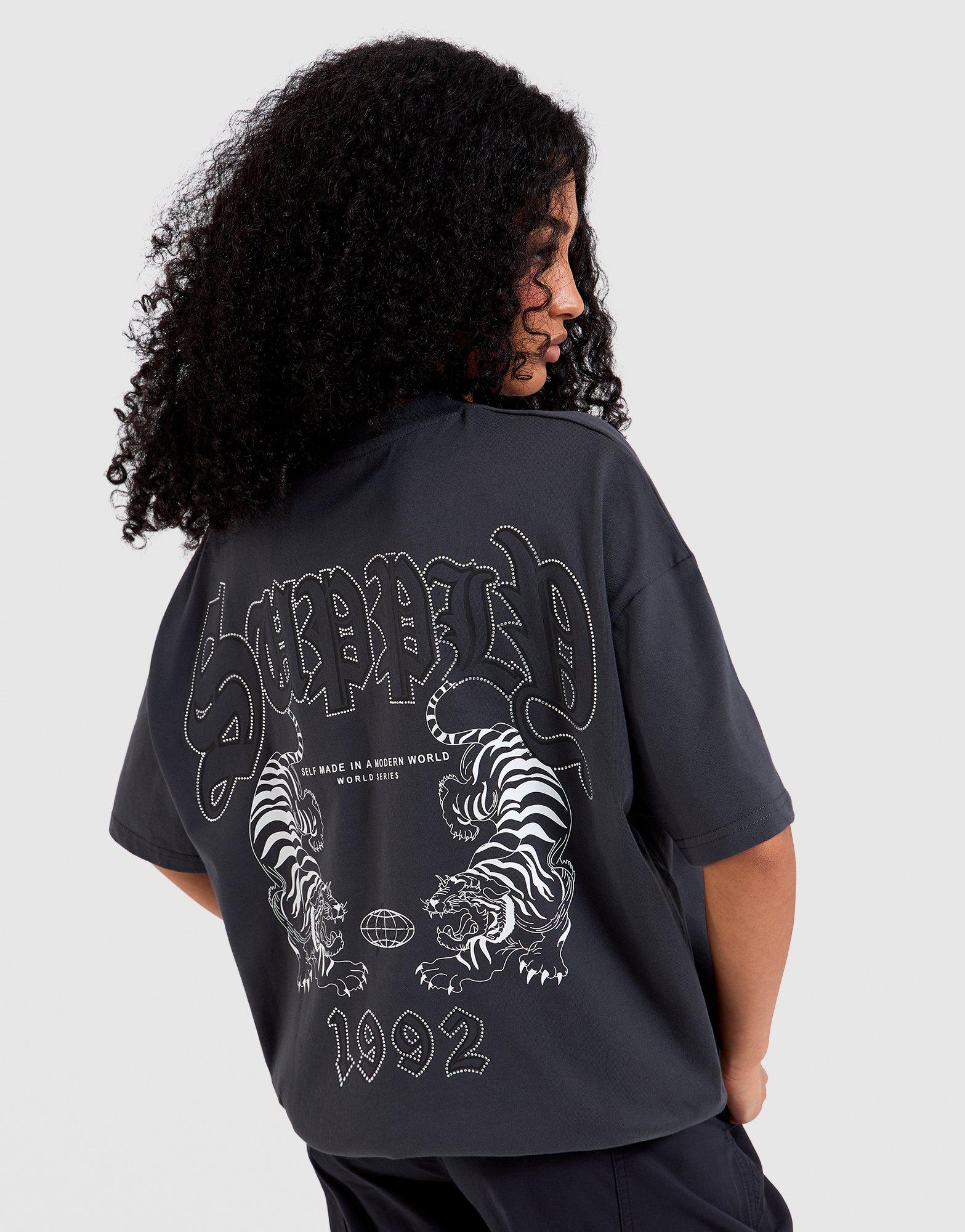 Bring fierce energy to your rotation with this women's Supply & Demand Tiger Graphic T-Shirt, exclusive to JD. Designed with an oversized fit and short sleeves, it features bold tiger graphics on the front and back for standout street style. The black base with white accents creates a versatile foundation that pairs with any bottom in your wardrobe. Built for comfort and confidence, this tee is a must-have for fans of graphic-led fashion. Style Code: SUPTW18240960
