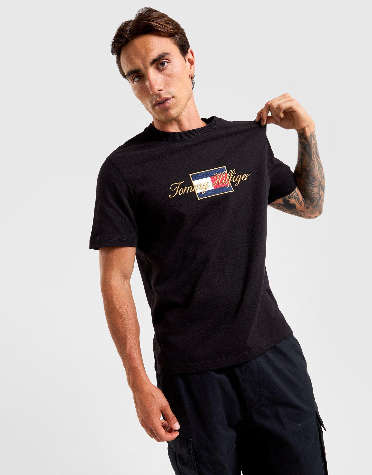 This men’s Tommy Hilfiger Icon Gold T‑Shirt in black is a bold, high-brand streetwear tee. Crafted from cotton-blend fabric, it features a standard fit for relaxed comfort. Short sleeves and premium branding make it perfect for casual layering or standout outfits.