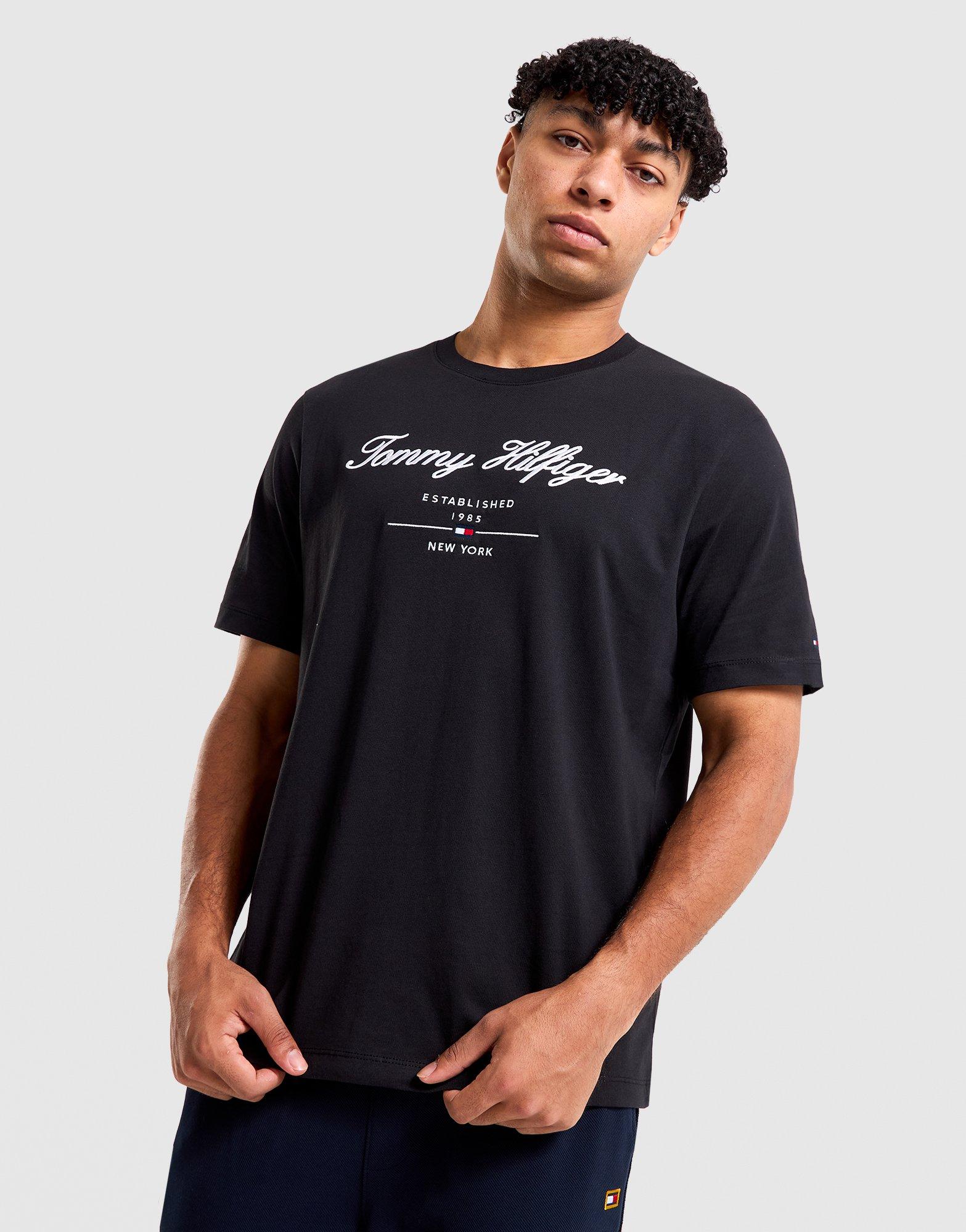 Keep it classic with this men's Tommy Hilfiger Script Logo T-Shirt. Designed with a standard fit and short sleeves, it features high brand read script branding in black with white accents. The timeless colourway and signature Tommy Hilfiger styling make it a versatile everyday essential. Perfect for casual wear or smart-casual occasions, this tee combines preppy heritage with modern wearability. Style Code: MW0MW33691_BDS