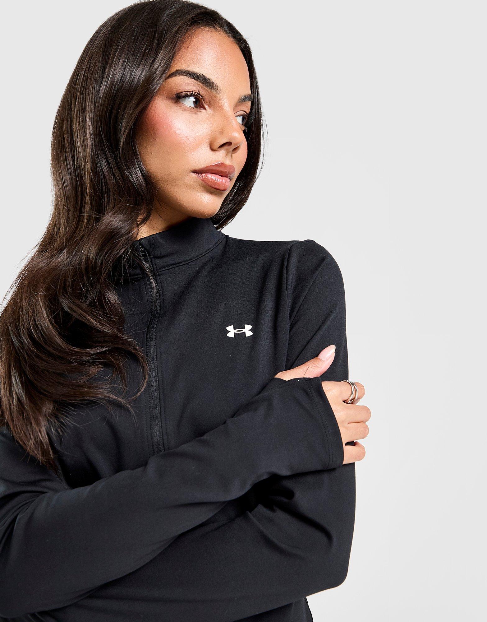Own cold weather sessions with Under Armour. This women's Motion 1/2 Zip Top is light, stretchy and moves sweat from the soft, brushed knit fabric. Thumbholes hold the sleeves in place, while a half zip collar adjusts the coverage. Finished with a shaped hem and a small Under Armour logo. Machine washable. | Our model is 5'7" and wears a size S.