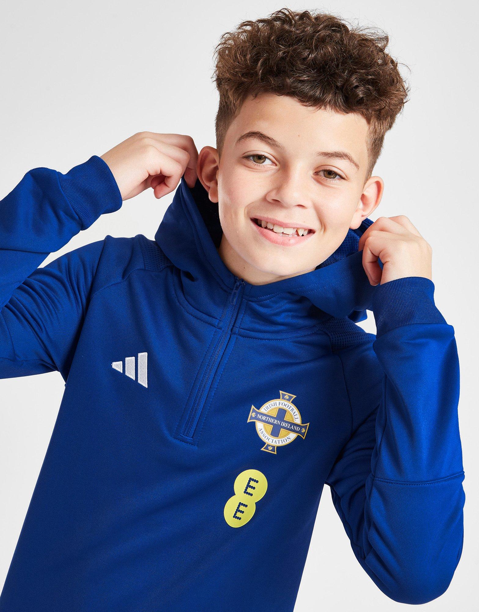 From the streets to the stadium, show your support in this juniors' Northern Ireland Tiro 23 Hoodie from adidas. In a Team Royal Blue colourway, this standard-fit hoodie is made from lightweight, recycled poly fabric. It comes with adidas' AEROREADY tech to wick away sweat, and has an overhead design with a quarter zip fastening and a fixed hood for extra coverage. Finished with signature adidas branding and the iconic Northern Ireland crest to the chest. Machine washable.|HU1354