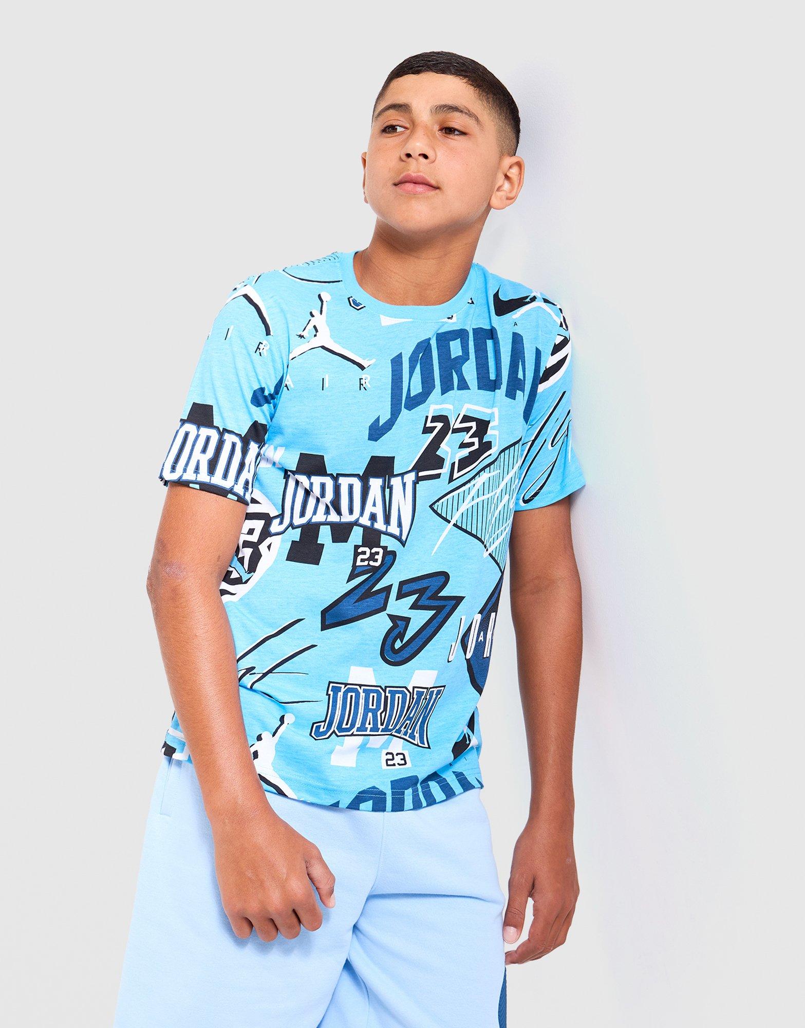 Elevate their rotation with this junior's Jordan Density T-Shirt, exclusive to JD. Designed with a standard fit and short sleeves, it showcases an eye-catching all-over print on a university blue base with white accents. The bold pattern brings premium Jordan style to everyday wear. Perfect for pairing with shorts or joggers, this tee delivers comfort and statement-making design. Style Code: 95F541-B9F