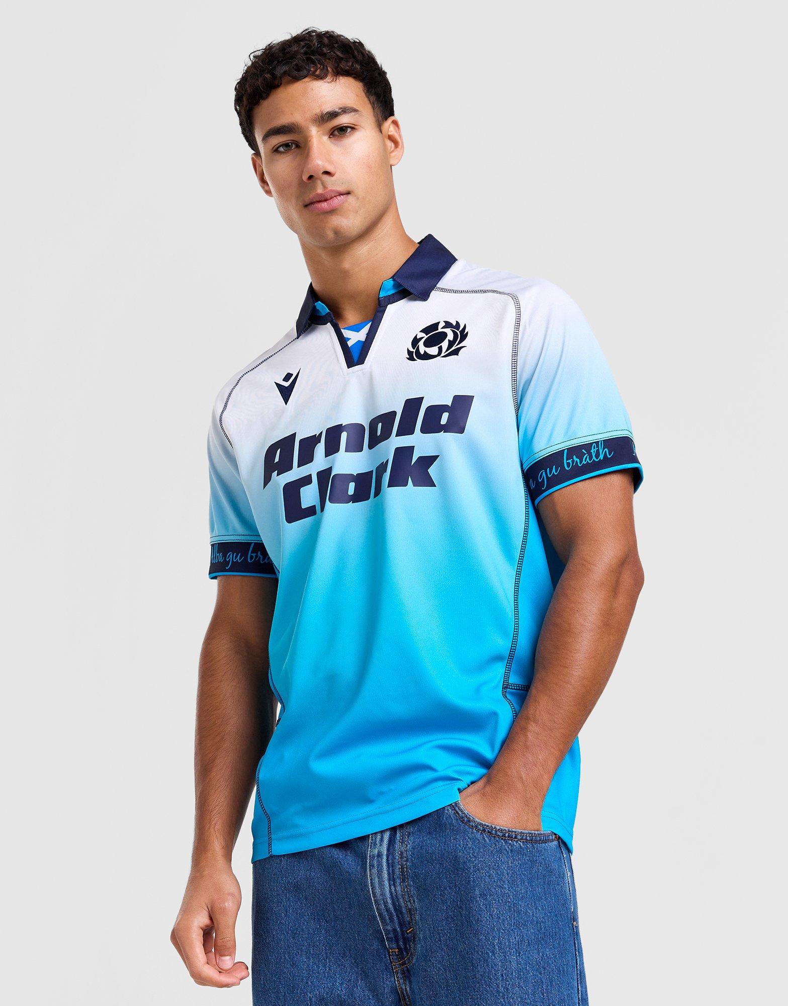 Show your love for your nation with this men's Scotland Rugby 2024/25 Away Shirt from Macron. In a White and Blue colourway, this standard fit shirt is cut from light, breathable polyester for cool comfort. It features short sleeves with a spread collar and has elasticated cuffs with 'alba gu bràth' printed on them to hold the shape. Finished up with Scotland flag to the collar, with the crest and Macron logo to the chest. Machine washable. | Our model is 6'0" with a 38" chest and wears a size medium.