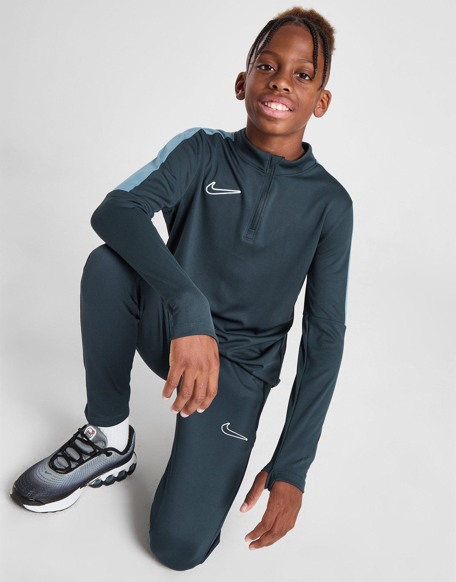 Pull on a pitch-ready look with this juniors' Academy 1/4 Zip Top from Nike. Landing in an Armoury Navy colourway with Storm Blue accents, this JD-exclusive training top is made from smooth polyester knit fabric, with sweat-wicking Dri-FIT tech added in for cool comfort. It features a quarter zip fastening and raised collar for custom coverage, while the long sleeves have thumbholes on the cuffs to hold them in place. Finished off with a signature Swoosh outline on the chest. Machine washable.