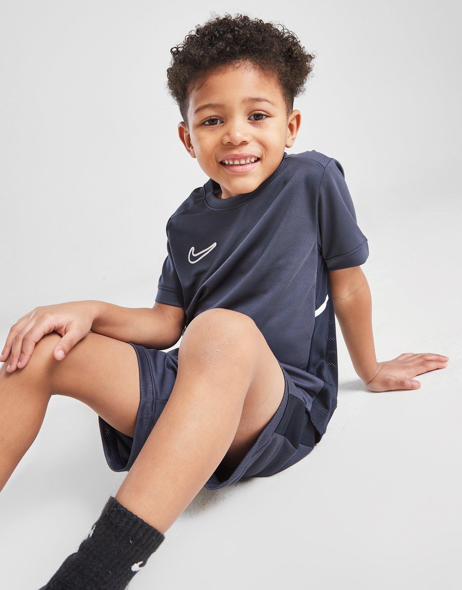 Refresh their active rotation with this children's Academy Crew T-Shirt/Shorts Set from Nike. In a Navy colourway, this JD-exclusive set is made with smooth, lightweight poly fabric for lasting comfort. It features a crew neckline and short sleeves for easy wear, while the matching shorts have an elasticated waistband for a secure fit. The mesh side panels provide extra ventilation, while Dri-FIT sweat-wicking tech keeps 'em feelin' dry. Finished up with an embroidered Swoosh logo to the chest and thigh. Machine washable.