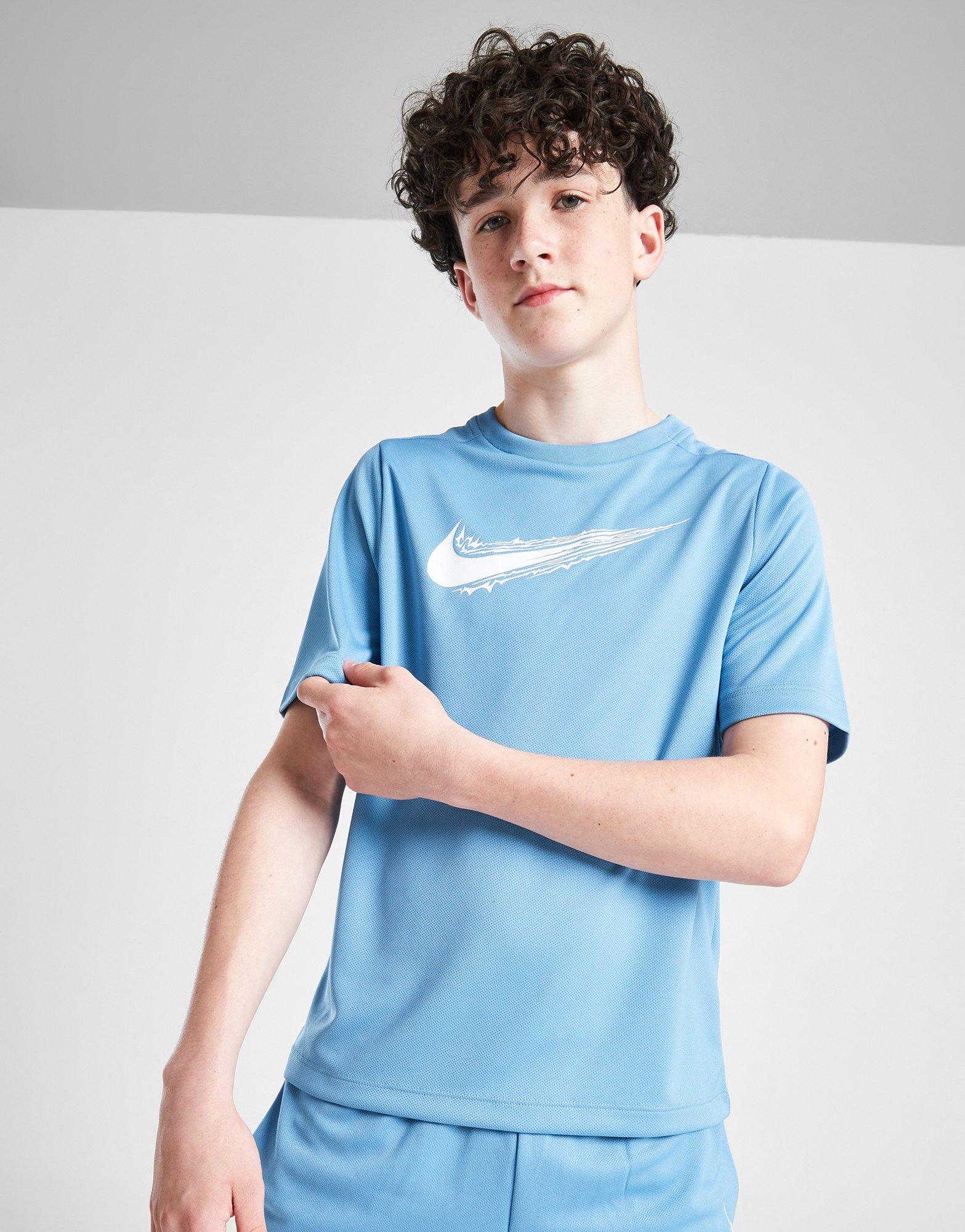 Refresh your off-duty rotation with this juniors' Multi Swoosh T-Short from Nike. In a Blue Beyond colourway with White accents, this tee is cut from smooth, lightweight polyester for cool comfort. It features a crew neckline and angled raglan sleeves for a roomy feel, with Dri-FIT sweat-wicking tech to keep things dry. Finished up with Swoosh branding on the chest. Machine washable. _