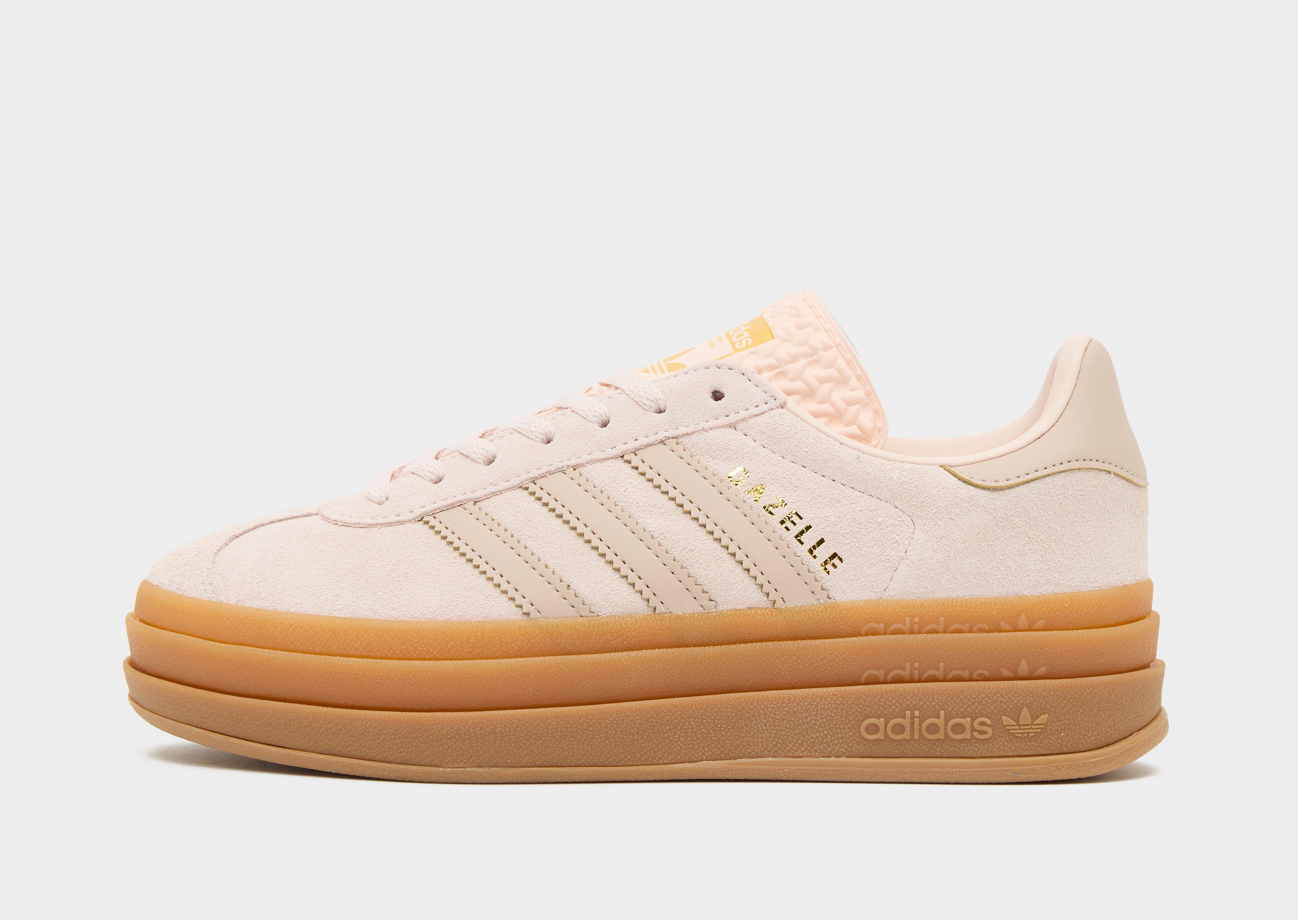 A classic gets stacked with these juniors' Gazelle Bold sneakers from adidas Originals. In a Wonder Quartz and Wonder Taupe colourway, these remixed Gazelles have a suede and leather upper, with the signature T-toe shape to the front. Underfoot, the staggered Gum rubber outsole delivers extra height and attitude as well as grip. Finished off with Gold foil Gazelle wordmark at the sidewall and the Trefoil on the tongue. | JQ1296