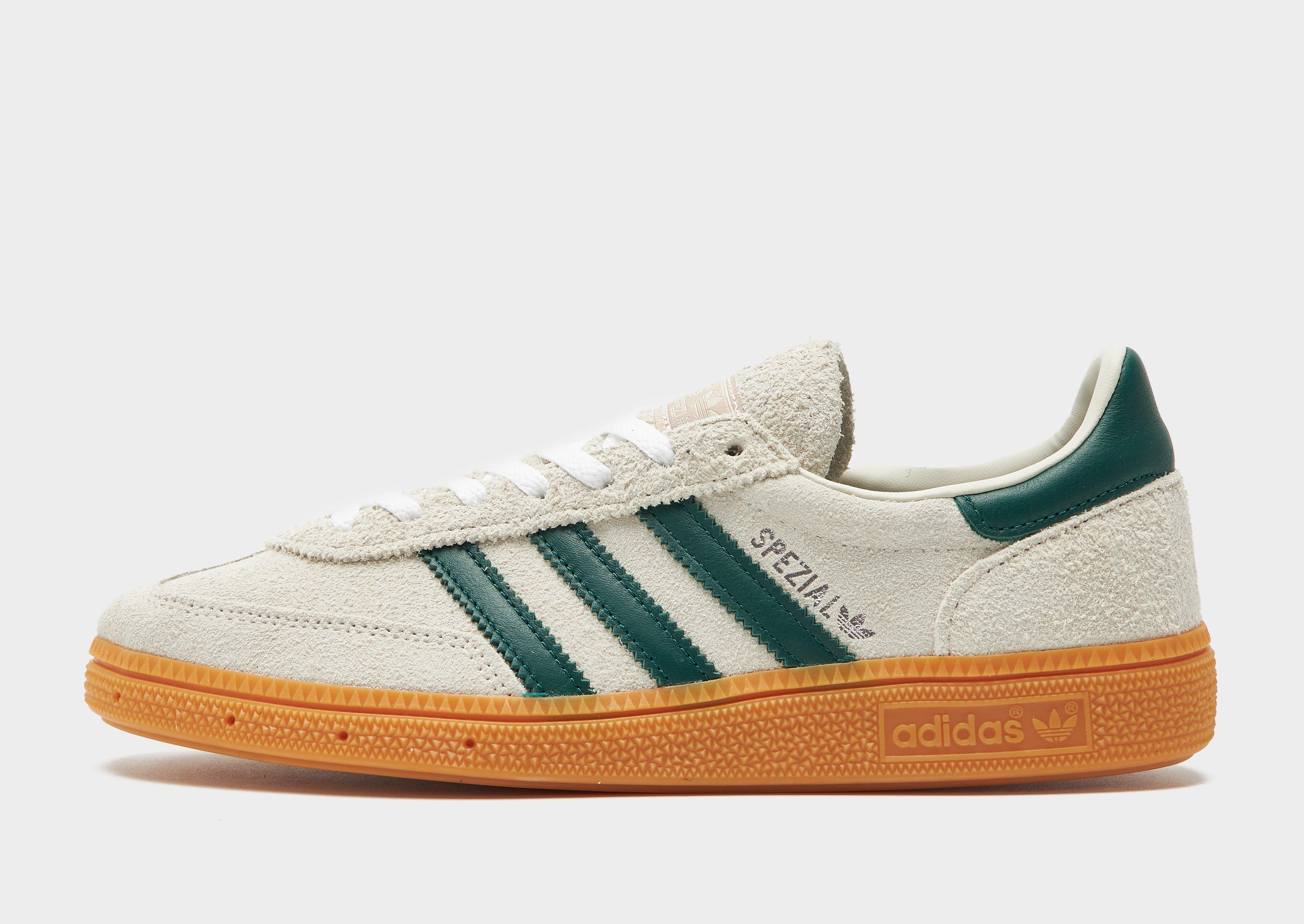 From the terrace to the street, rep a classic look with these women's Handball Spezial shoes from adidas Originals. First introduced in 1979 for the speedy handball courts of Germany, the simple yet stylish silhouette quickly made it a go-to, iconic trainer. Landing in a Grey colourway with Green details, these JD-exclusive sneakers have an upper made with suede and nylon for durable wear. They feature a lace fastening with a padded ankle collar for alocked-in fit and sit on a lightweight midsole. With a gum rubber outsole for total traction, they're signed off with signature Adi 3-Stripes to the sidewalls.