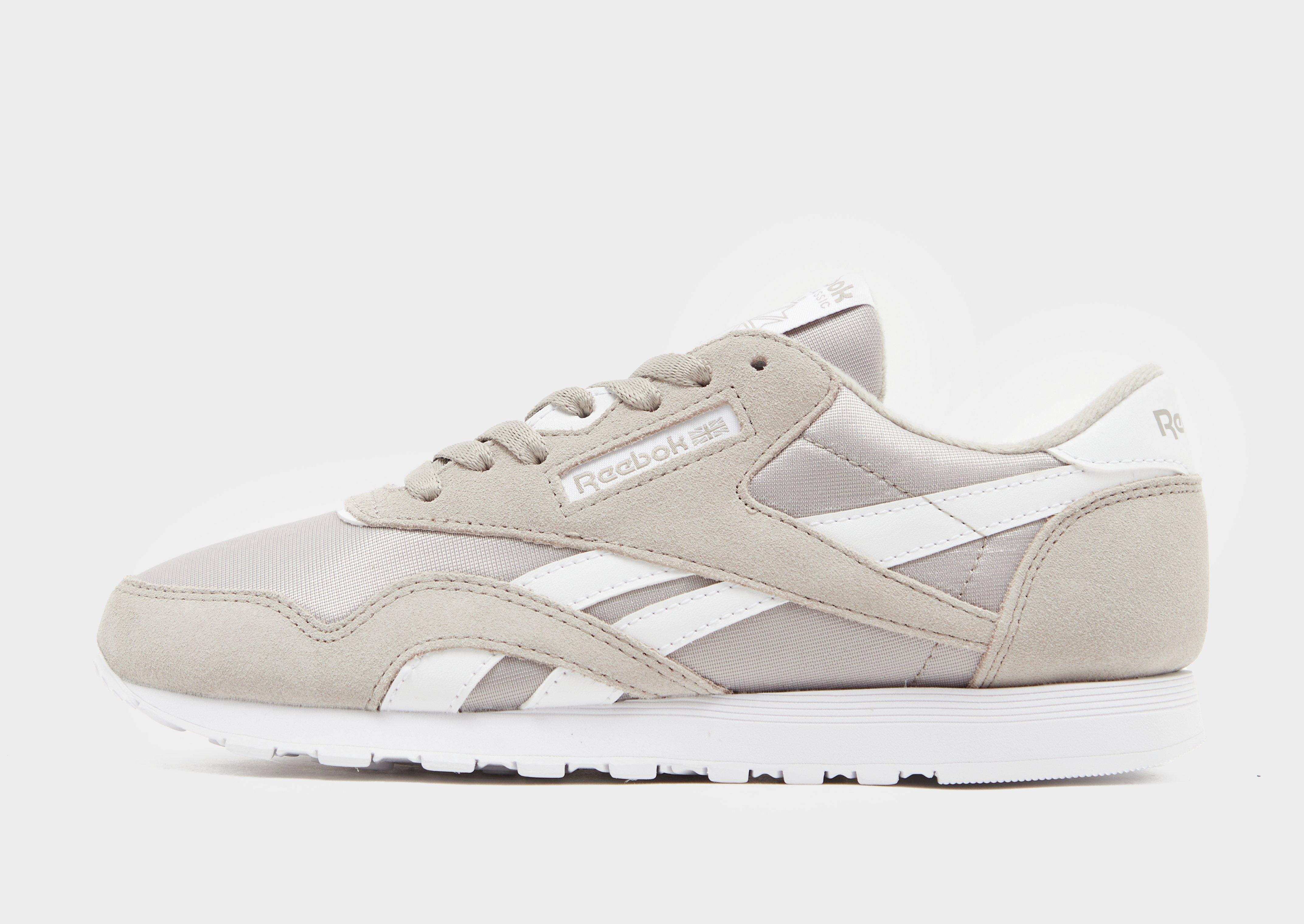 Go classic on your feet with these men's Classic Nylon sneakers from Reebok. In an Ash and White colourway, these JD-exclusive sneaks are cut from light and breathable nylon, with smooth suede overlays. They feature a lace fastening to lock you in, with a padded collar for support. Underfoot, they sit on a soft foam midsole for a smooth ride, with a grippy rubber outsole for firm traction. Signed off with classic Reebok branding.