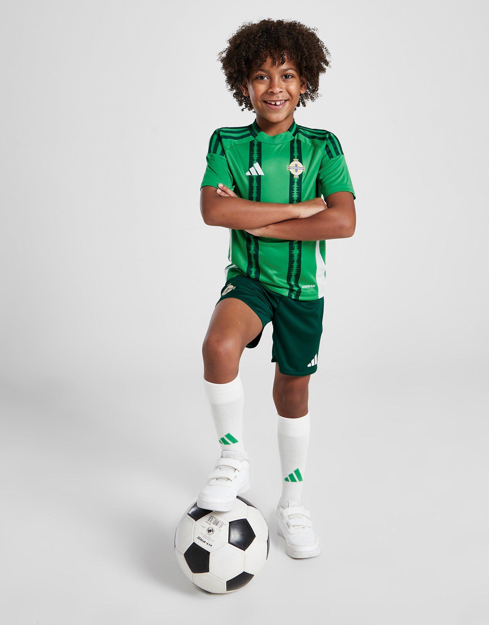 Get the next gen of supportives ready for matchday with this children's Northern Ireland 2024 Home Kit from adidas. In a Vivid Green and White colourway, this downsized kit is made from smooth and breathable recycled polyester fabric to keep them cool. It's packed with sweat-wicking AEROREADY tech throughout, featuring a ribbed crewneck shirt and regular-fit shorts with an elasticated waistband. With stretchy knee-length socks to complete the set, this kit is finished with the Performance logo and Northern Ireland crest. Machine washable. | JF2634