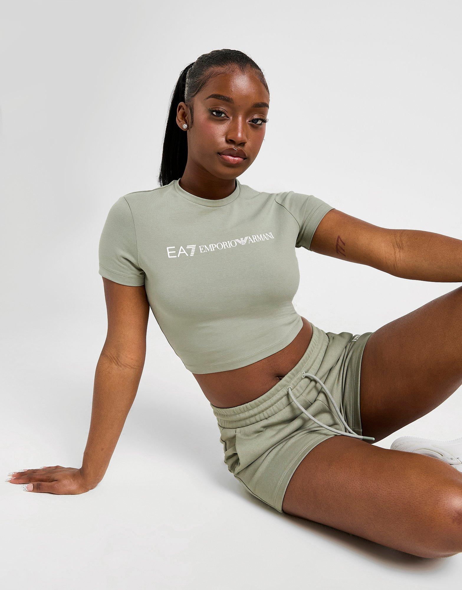 Add some JD-exclusive style to your off-duty rotation with this women's Logo Slim Crop T-Shirt from EA7 Emporio Armani. In a Green colourway, this slim-fit tee is cut from soft, stretchy cotton fabric for total comfort. It features a ribbed crew neckline, short sleeves, and a cropped hem, and is signed off with EA7 Emporio Armani branding on the chest. Machine washable. Our model wears a size S.