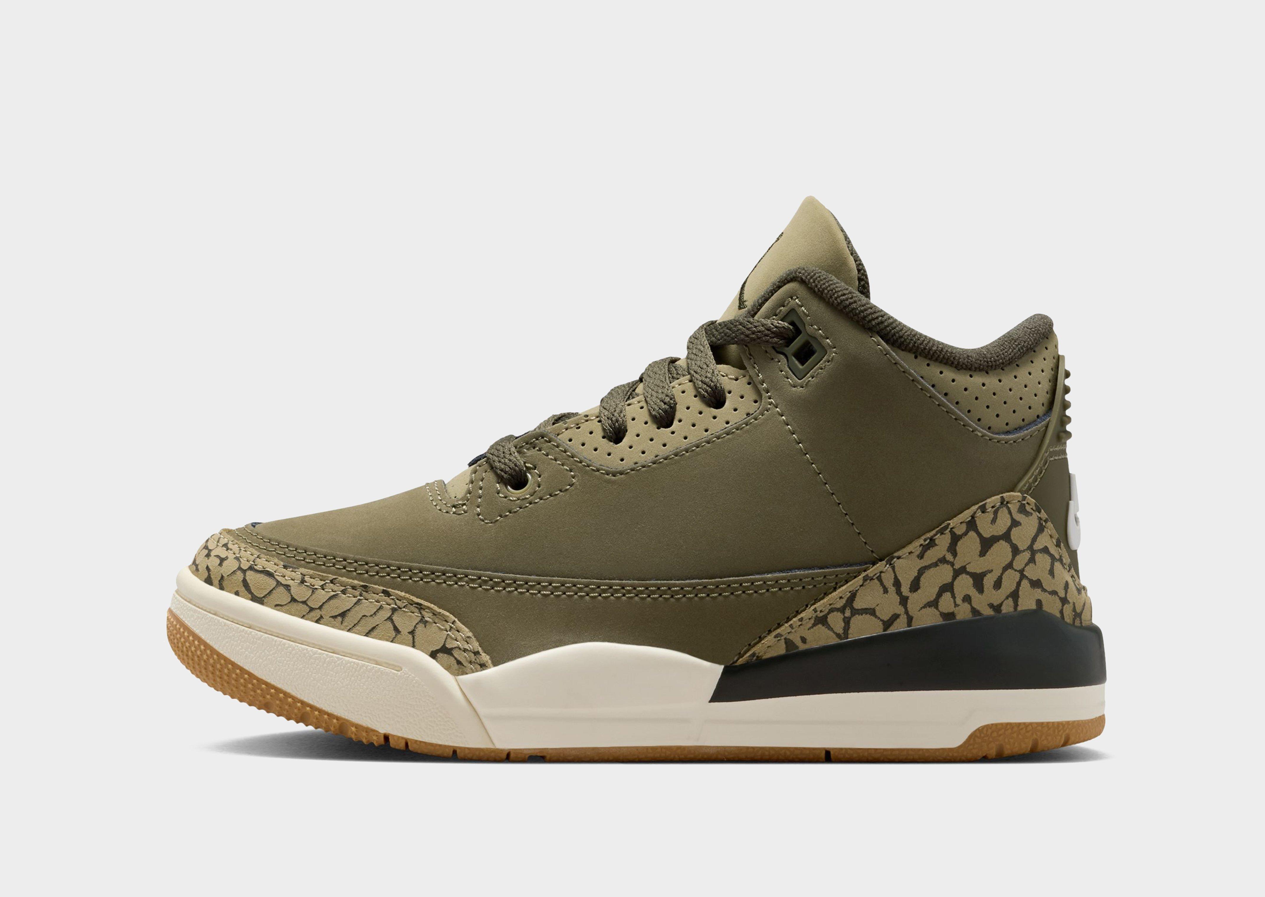 Add a sneaker icon to your sneaker collection with the Air Jordan 3. First introduced in ’88, the AJ3 not only marked the debut of the legendary Jumpman logo, but also introduced the visible Air cushioning and iconic elephant print detailing. The AJ3 remains a symbol of greatness, blending heritage with innovation. Coming in an Olive colourway with Grey details, these children's mid-top shoes have a premium leather upper that reps Jordan's iconic elephant print across the overlays. They feature a tonal lace up fastening and a padded ankle collar for long-lasting comfort. Underfoot, these shoes are sat on a flexible foam midsole, which keeps feet supported, while visible Air cushioning levels up the comfort. With a grippy rubber tread, they're finished up with Nike Air branding to the heel and the iconic Jordan Jumpman logo to the tongue.” Style Code: DM0966-202