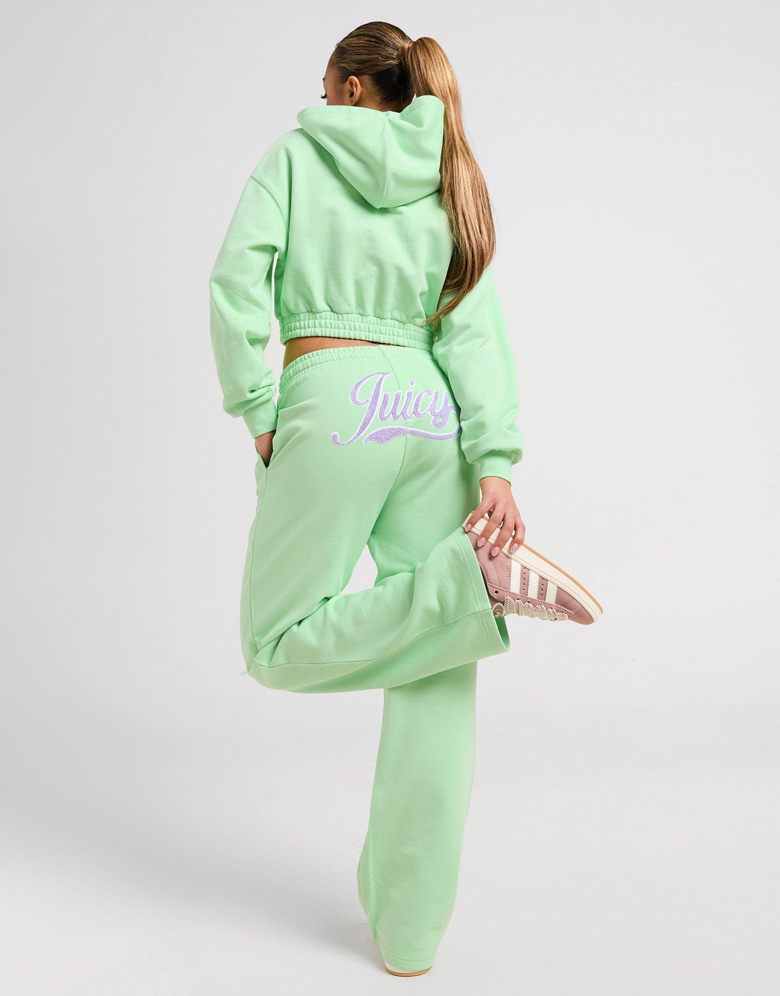 Turn heads even on off-duty days with these women's Script Boucle Logo Joggers from Juicy Couture. Exclusive to JD, these Mint joggers are made from a soft cotton fleece fabric for cosy layering. They feature a drawcord-adjustable tie to the elastic waistband, while uncuffed hems sit over the ankles for a throwback shape. Finished off with open hand side pockets and Purple boucle Juicy branding embroidered to the rear and left thigh. Machine washable. | Our model is 5'8" and wears a size S.