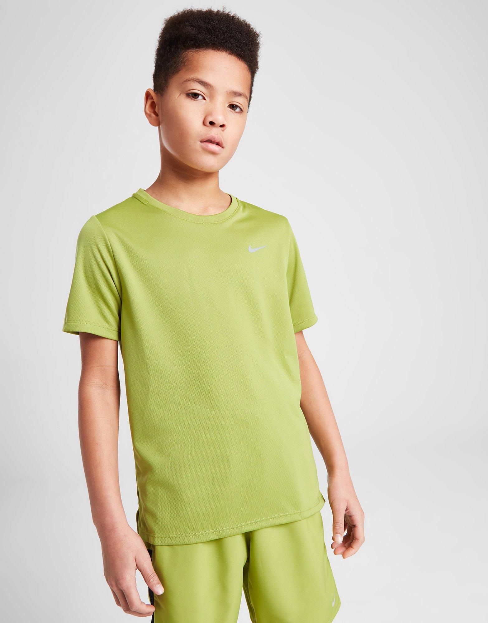 Stock up on sports staples with this juniors' Miler T-Shirt from Nike. In a Pear colourway, this regular-fit tee is made with smooth, lightweight polyester for lasting wear. It's engineered with sweat-wicking Dri-FIT technology with hem vents for a little extra give as you move, and features a classic crew neckline and short sleeves. Finished with a reflective Swoosh logo to the chest. Machine washable.