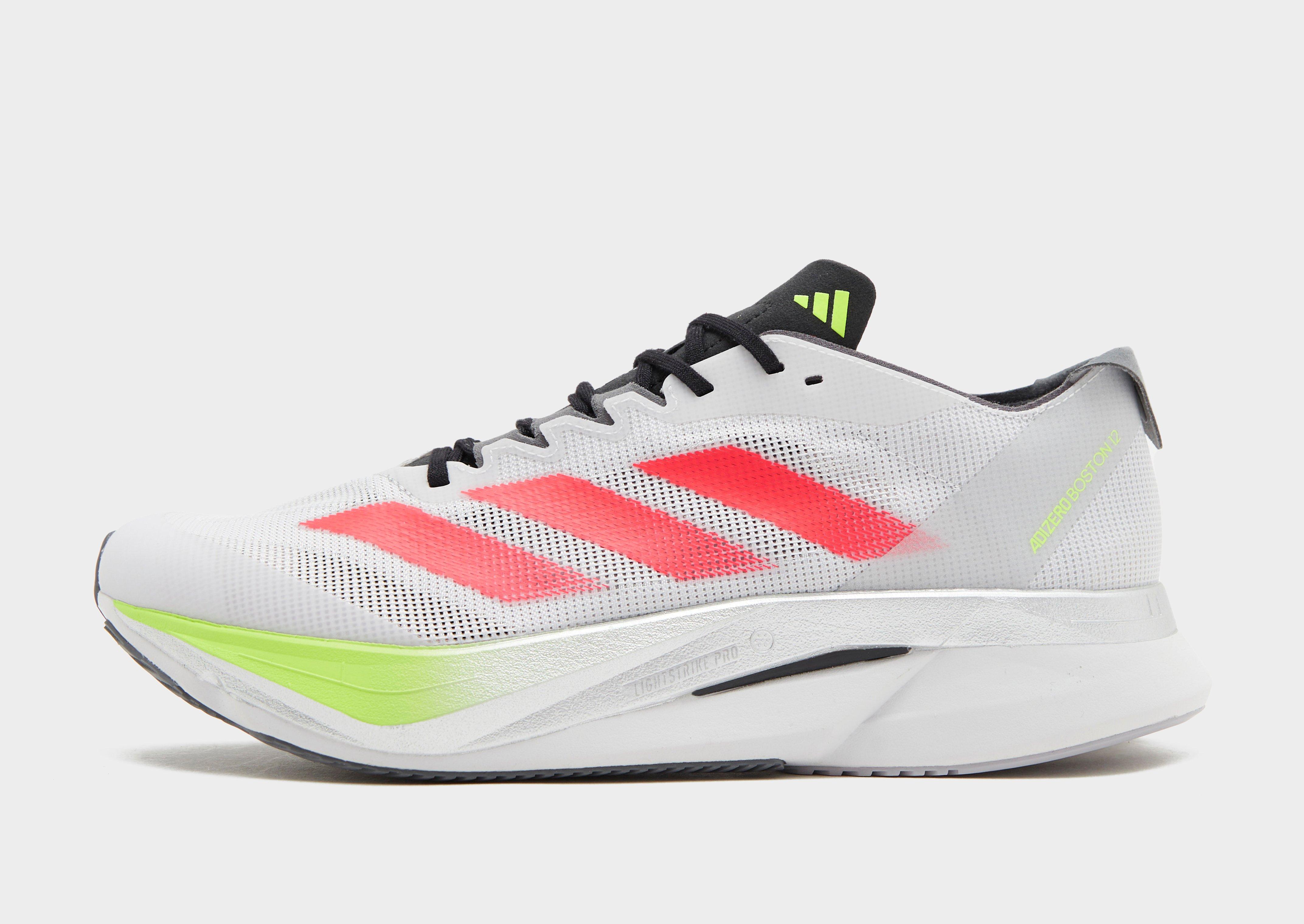 It's all about race day pace with these men's Adizero Boston 12 trainers from adidas. In a Dash Grey colourway, these Boston Marathon-inspired runners are sat on layers of Lightstrike Pro cushioning with a new version of durable Lightstrike 2.0 EVA to reduce fatigue. The ENERGYRODS 2.0 return energy when you take off for forward motion, while the engineered mesh upper keeps things breathable. They offer a neutral ride and a regular fit, with 7mm of drop from the heel to toe. Built for mid- to long-distance runs, they have a Continental Rubber outsole. Finished off with Lucid Red 3-Stripes and a Lucid Lemon Performance logo. | JI4472