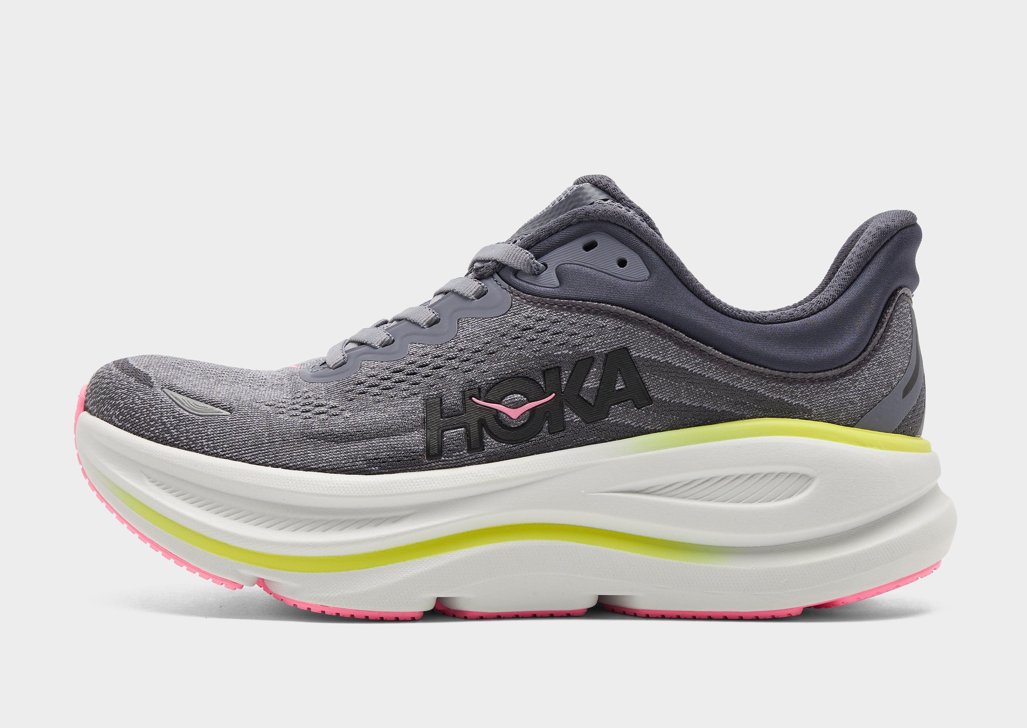 Make every mile count with these women's Bondi 9 running shoes from Hoka. In a Grey colourway with Pink details, these runners are cut from light, breathable mesh in the upper that includes 50% recycled polyester. They feature a lace fastening to lock you in, with a padded collar for added support and an Ortholite sockliner for a snug fit. Underfoot, they sit on a chunky foam midsole for a smooth ride, with a grippy rubber outsole for traction. With heel tabs for easy on-and-off, they're finished up with classic Hoka branding. Style Code: 1162012-CYG